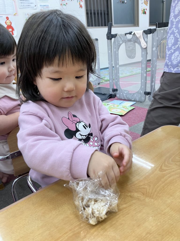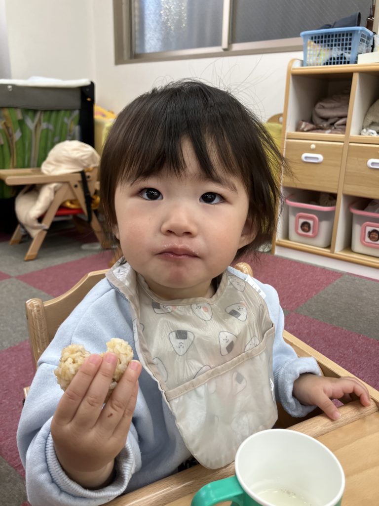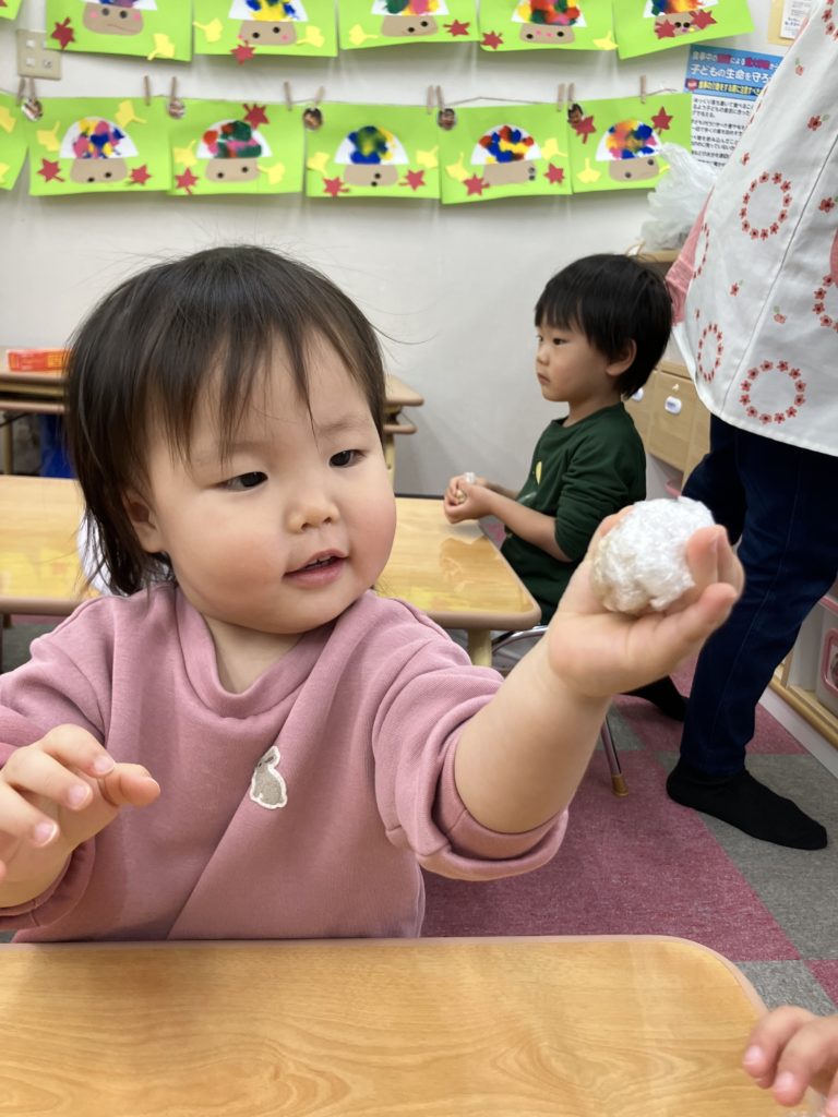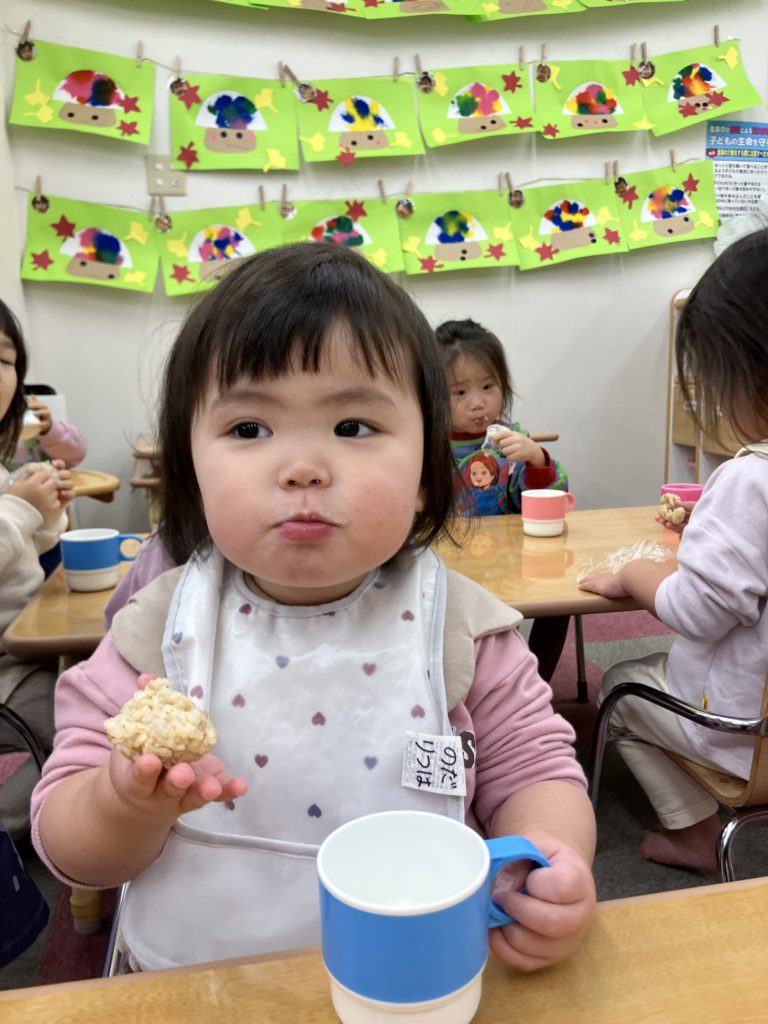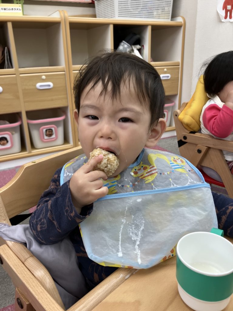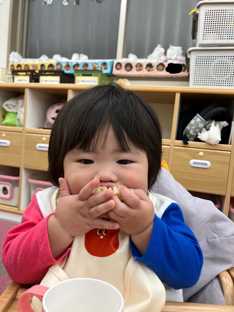 午後のおやつは、2歳児中心でおにぎり作りをしました。上手に握れたかなぁ❓