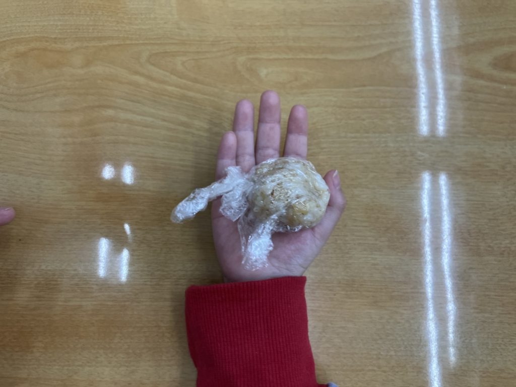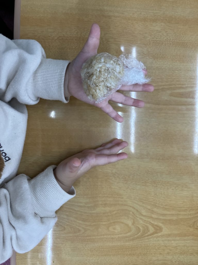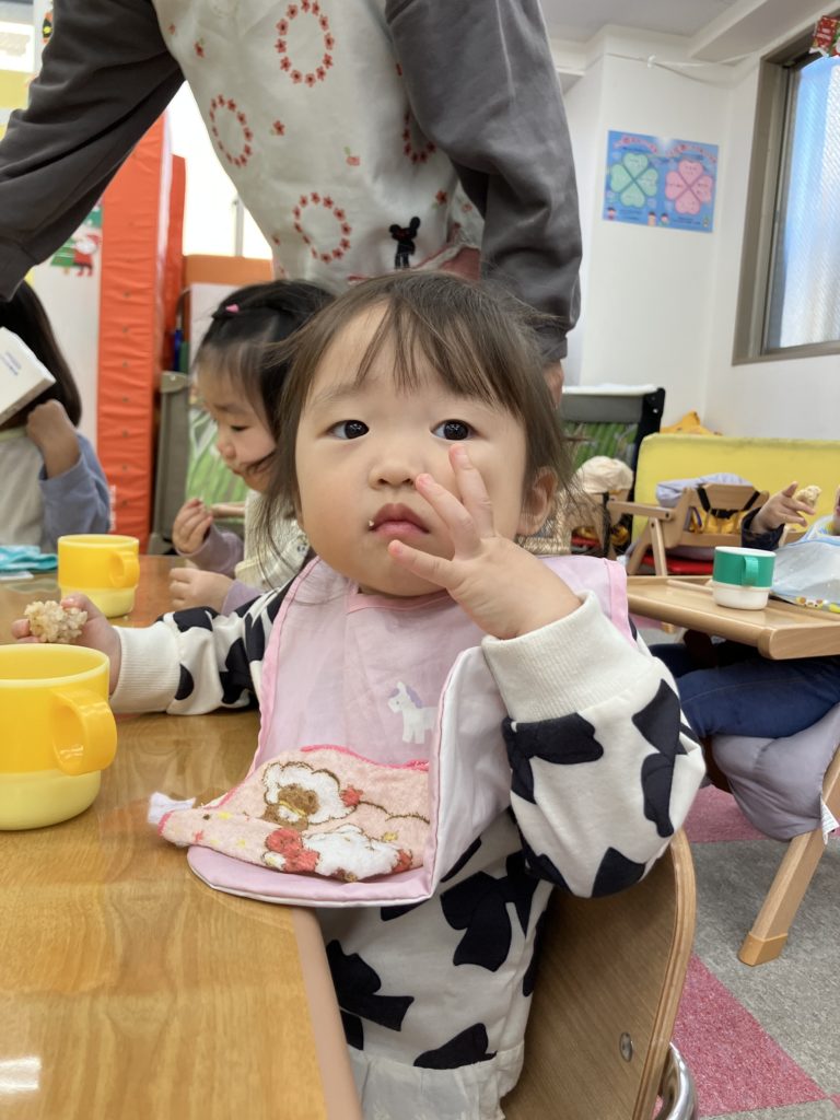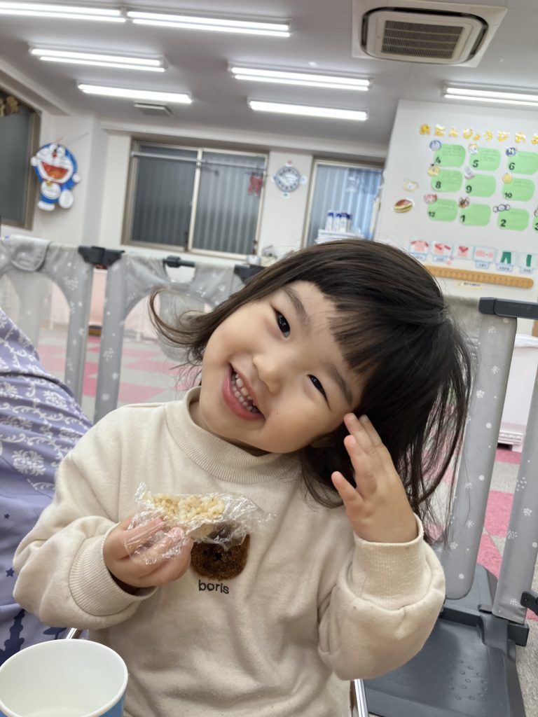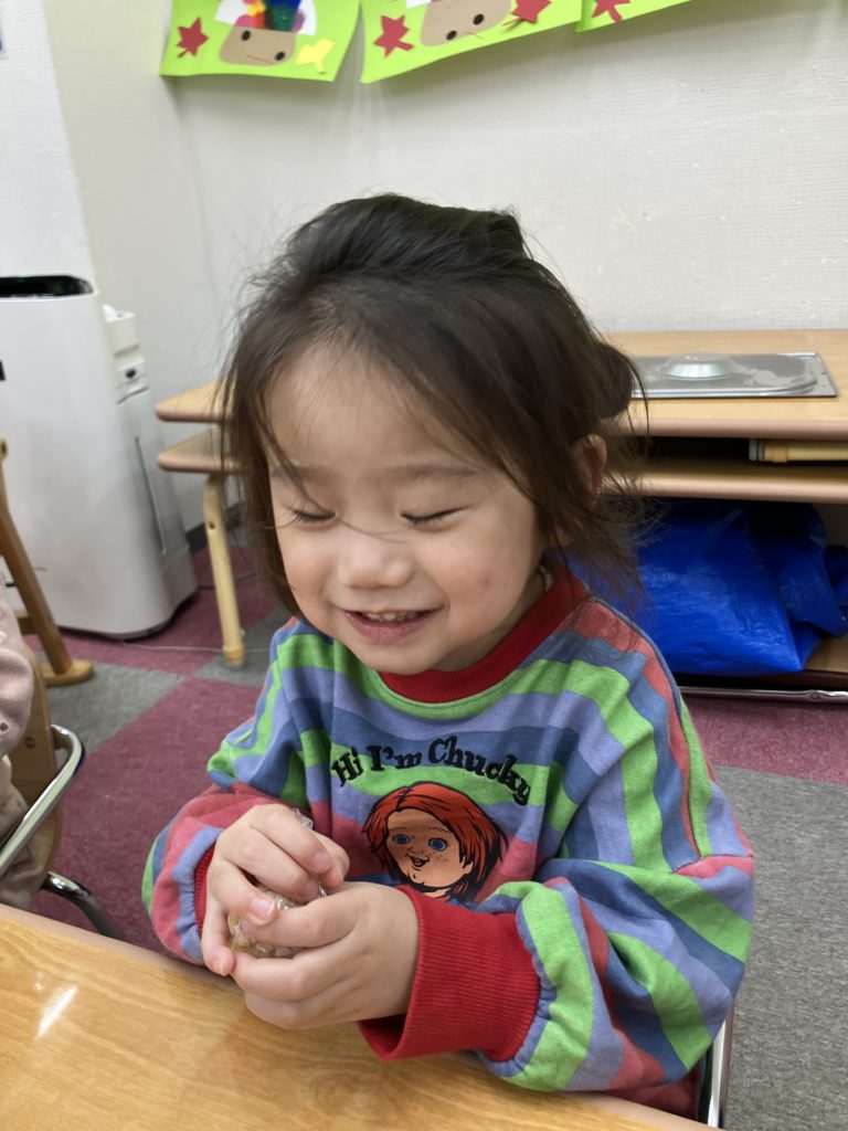 午後のおやつは、2歳児中心でおにぎり作りをしました。上手に握れたかなぁ❓