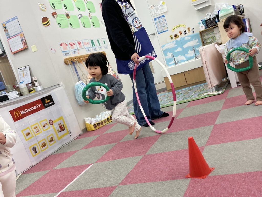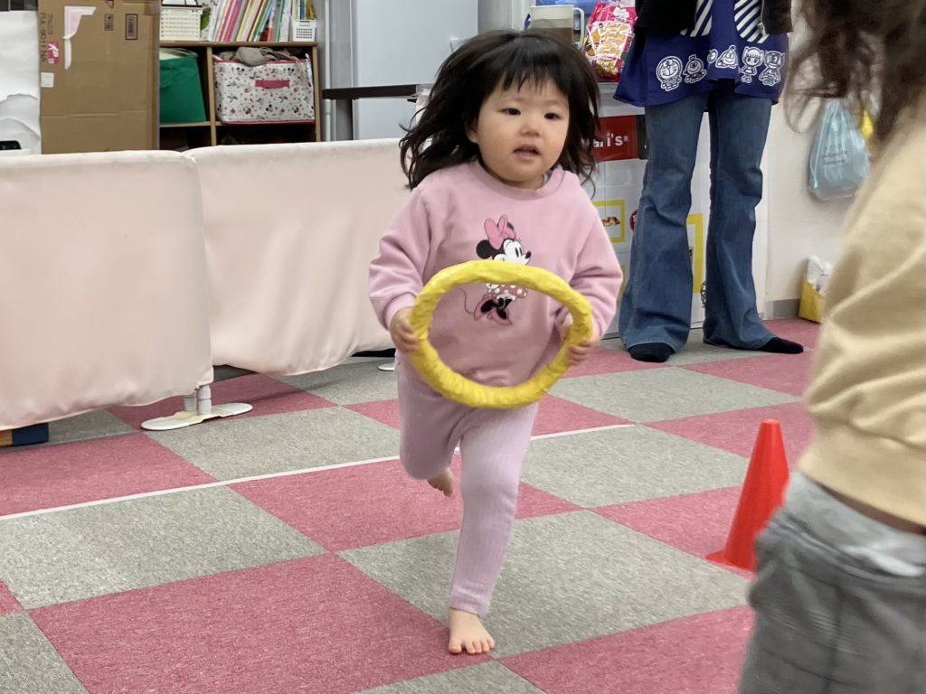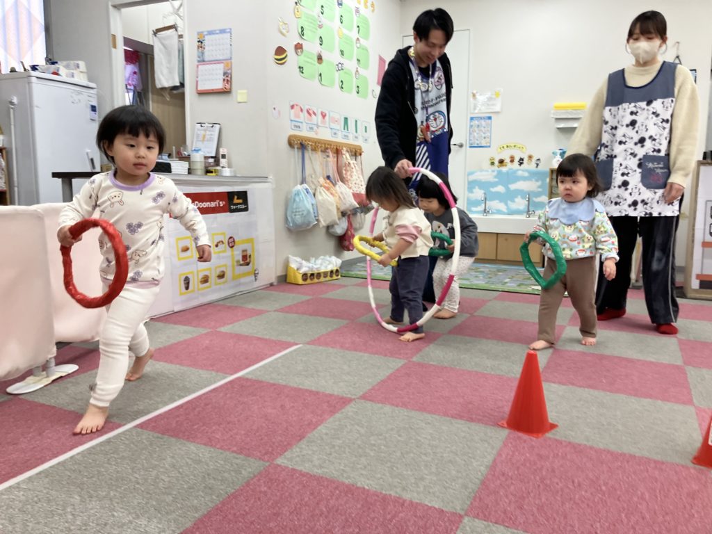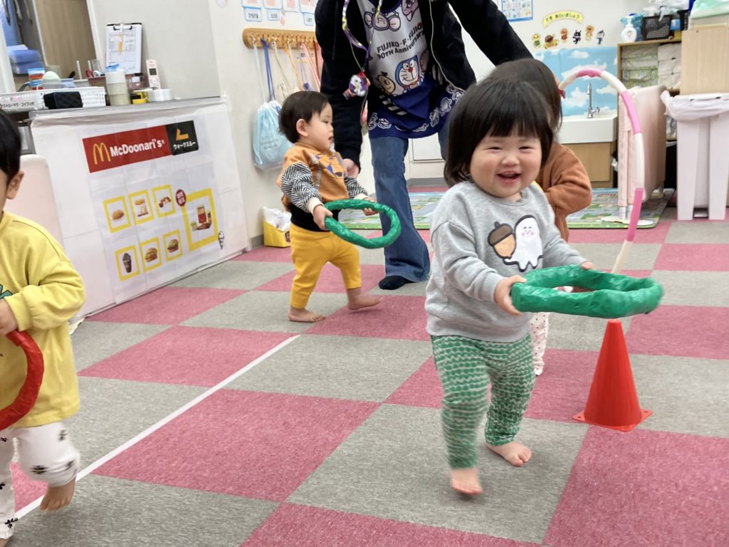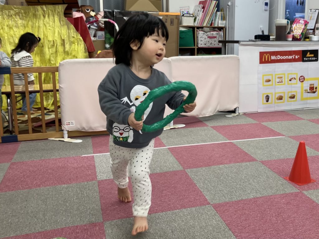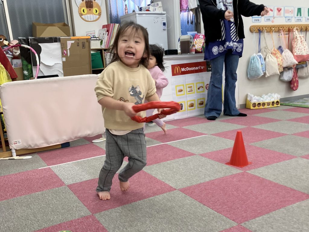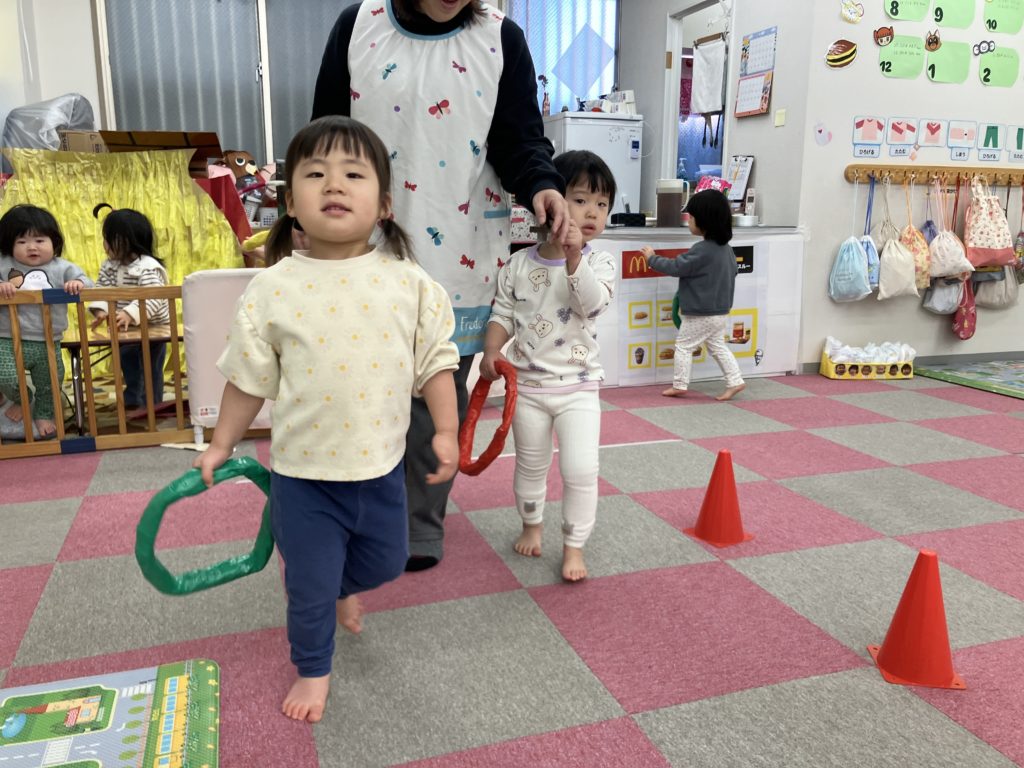 週末の疲れも見られ、朝から賑やかだった今日は室内でかけっこをしました。バトンをもってリレー気分で走りました🏃♀️💨