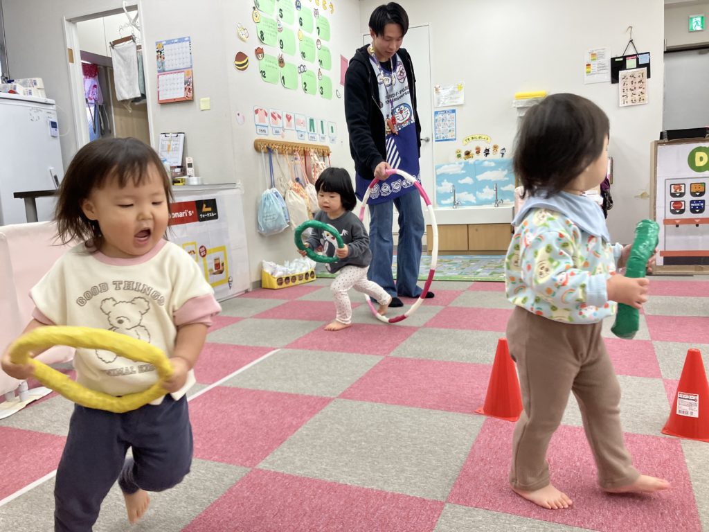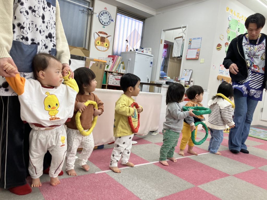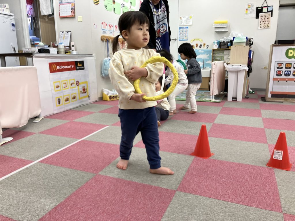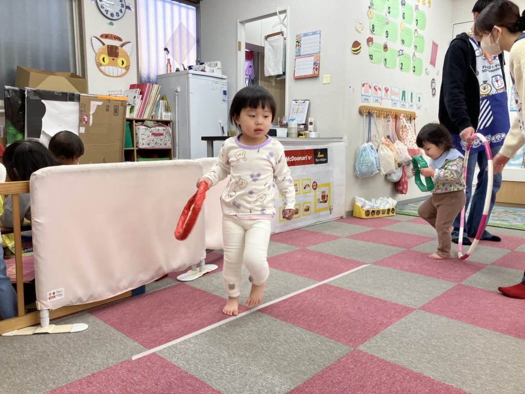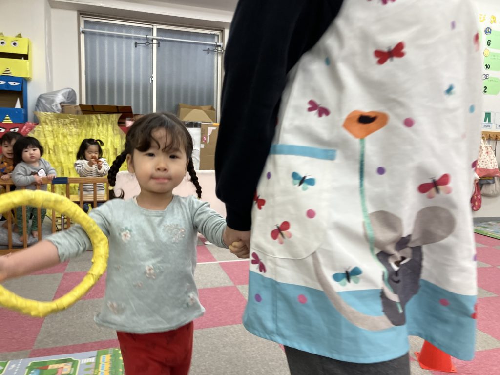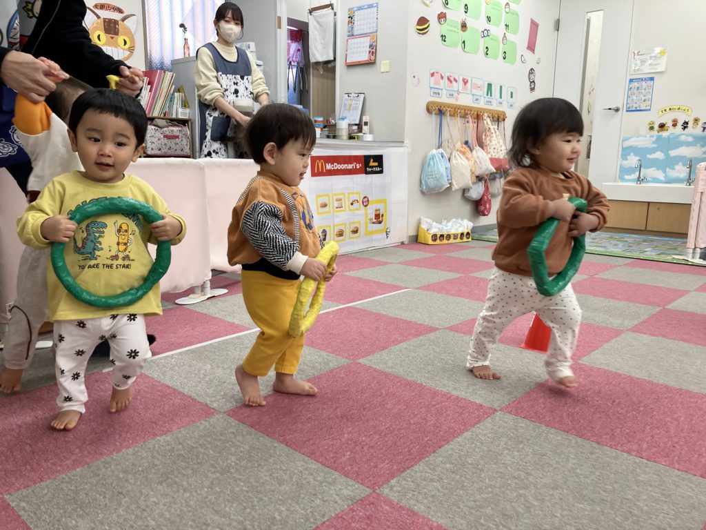 週末の疲れも見られ、朝から賑やかだった今日は室内でかけっこをしました。バトンをもってリレー気分で走りました🏃♀️💨