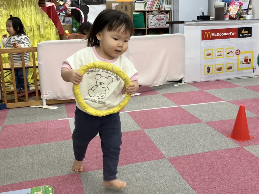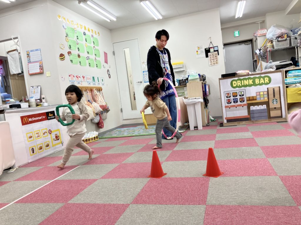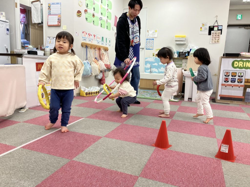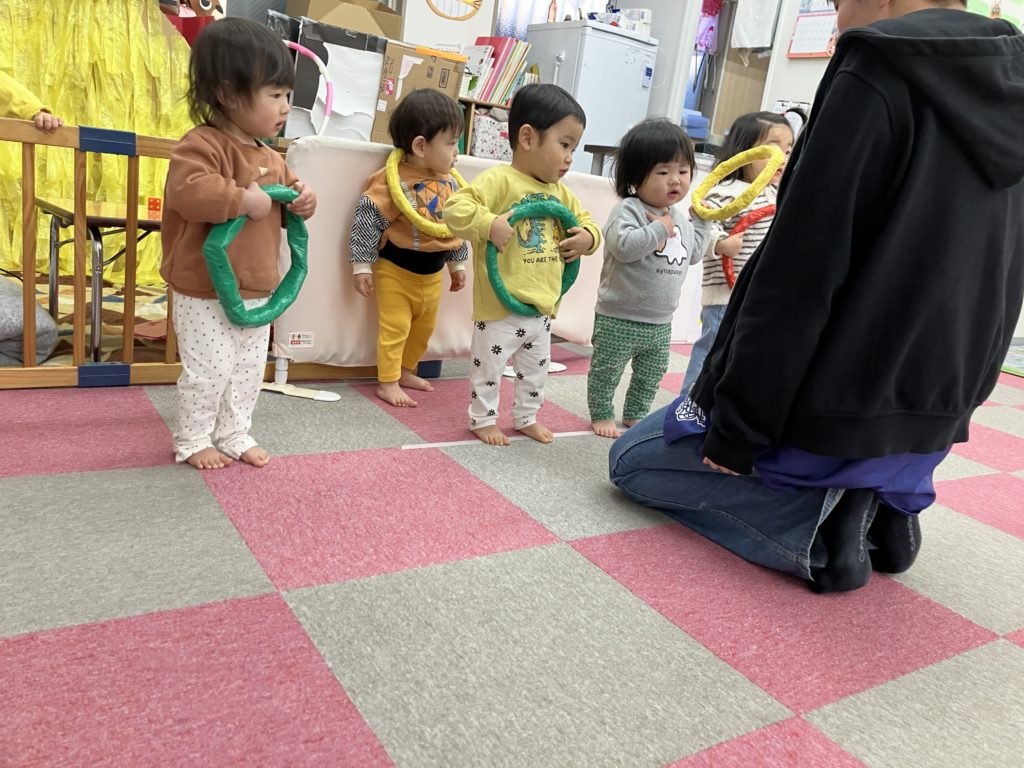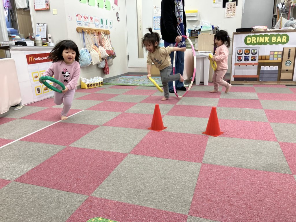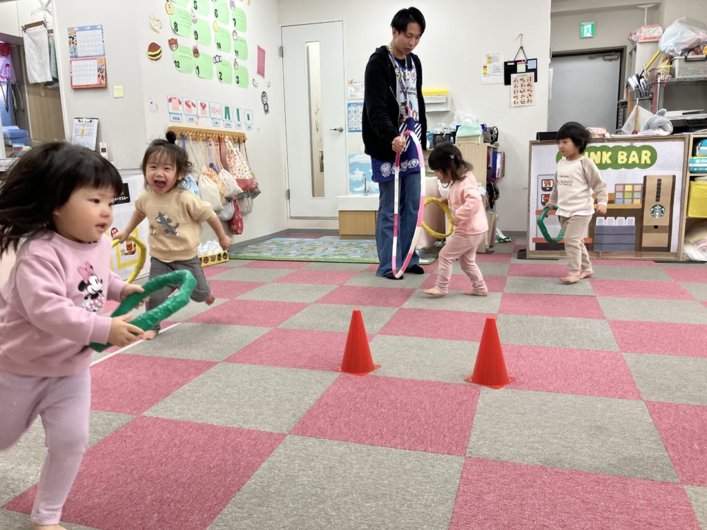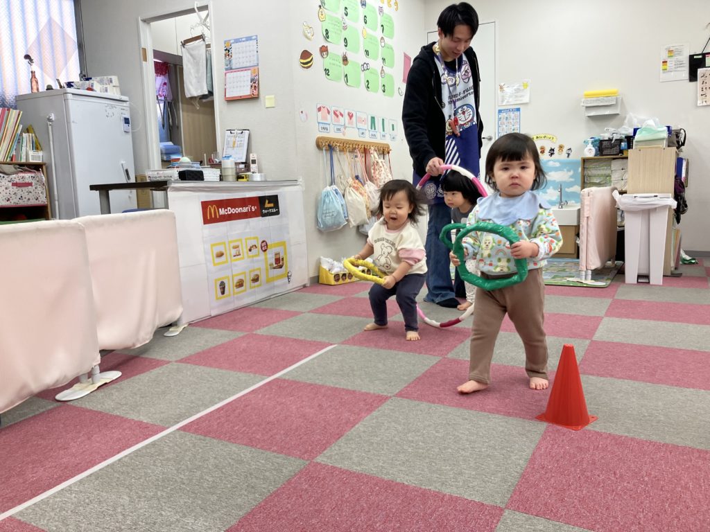 週末の疲れも見られ、朝から賑やかだった今日は室内でかけっこをしました。バトンをもってリレー気分で走りました🏃♀️💨