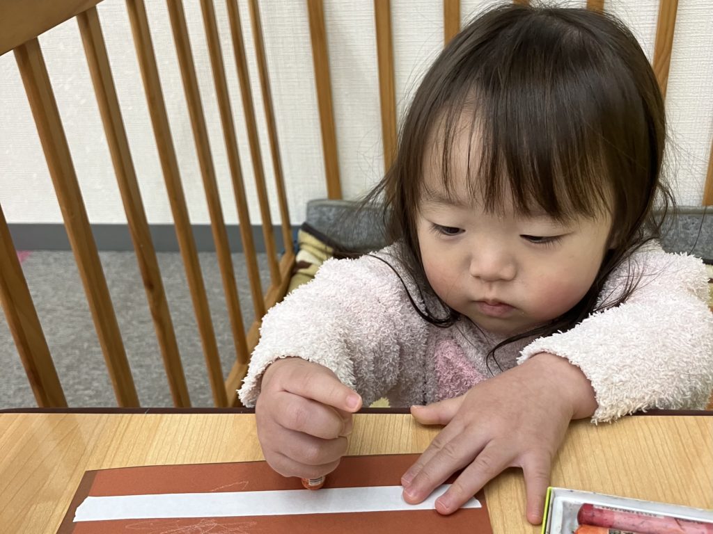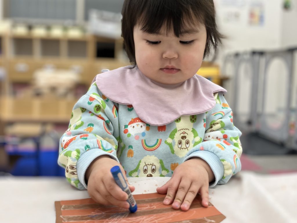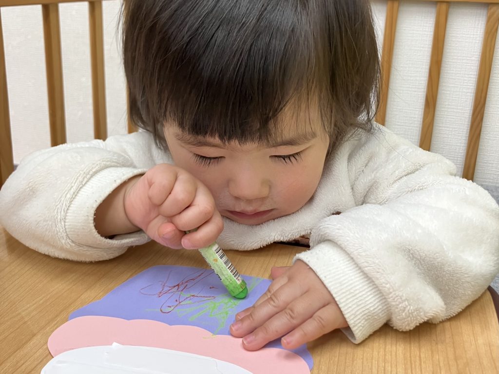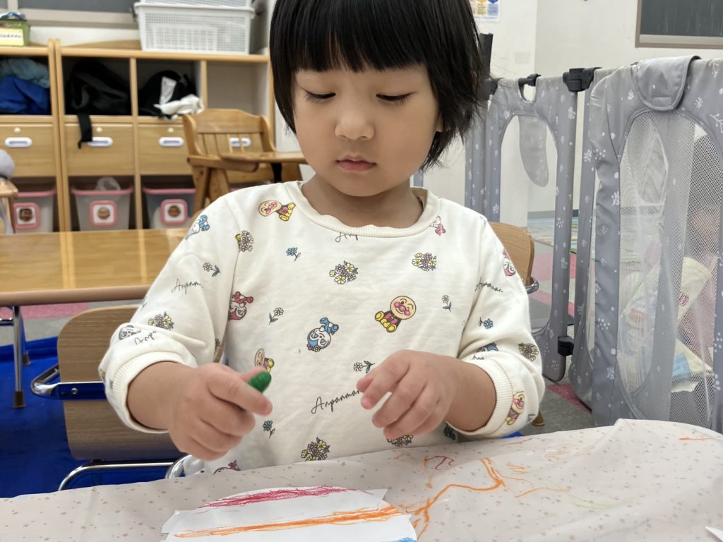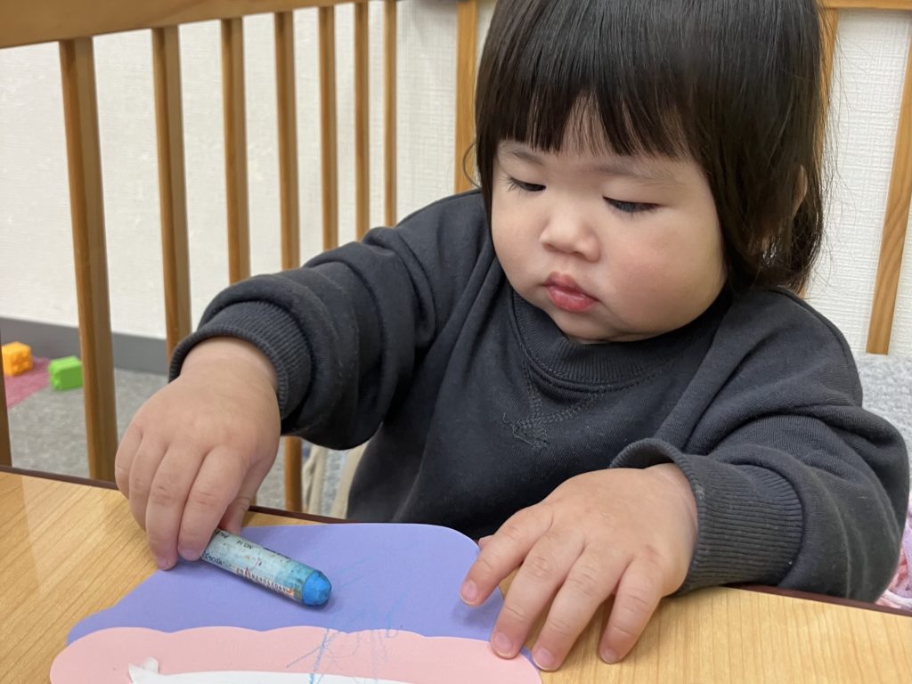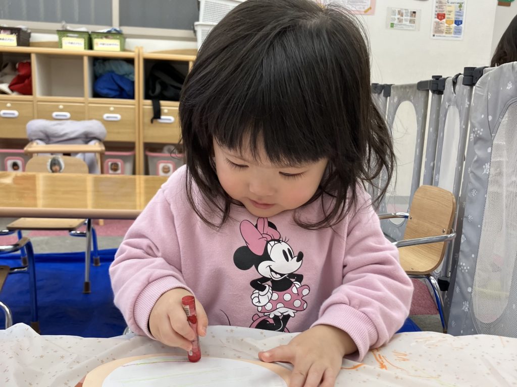 先週から今日までの間で2月の製作も行いました。クレヨンや絵の具を用いてたくさんお絵描きできました🎨