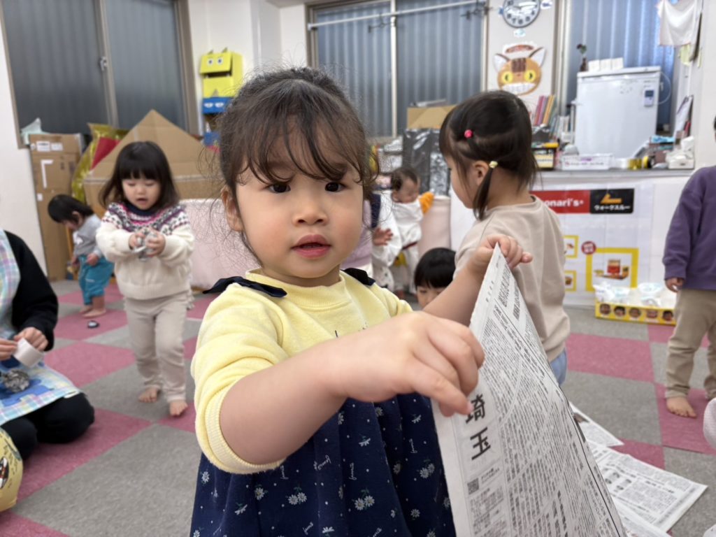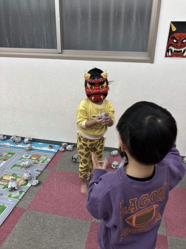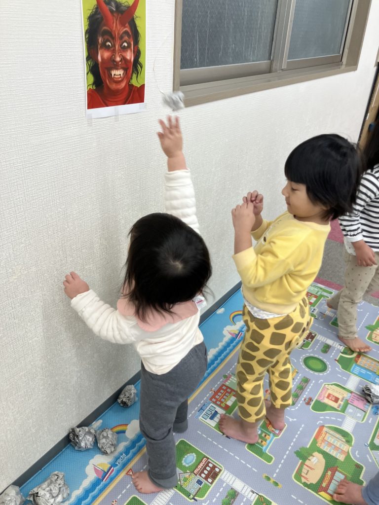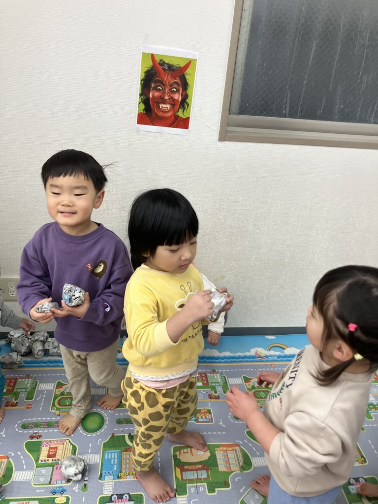 今日は明日の節分に向けて、新聞紙で鬼を退治する時に使う豆を作りました👹✨その後は実践練習も行い、鬼退治に気合い十分な子どもたちです💪🏻✨