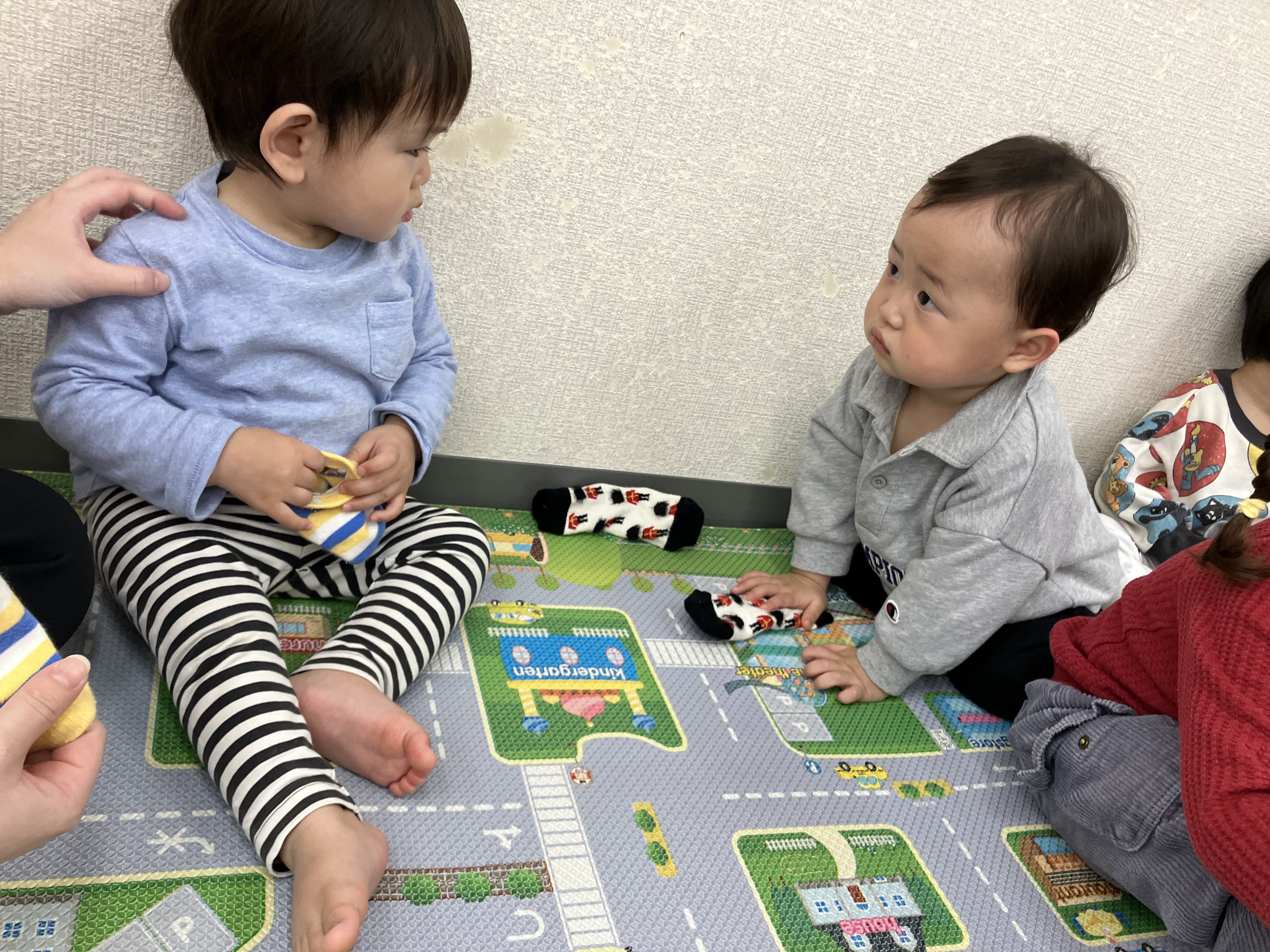 今日は初めて桜成公園に行ってみました。初めて行った公園だったので子どもたちは喜んで遊んでましたよ☺️ ⭐️外に行く準備⭐️ 靴下履けるかな❓履けたよー ⭐️公園へレッツゴー⭐️