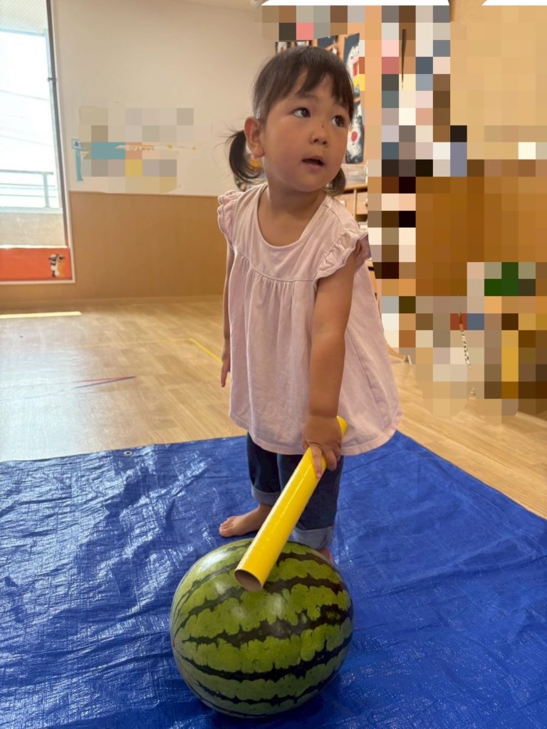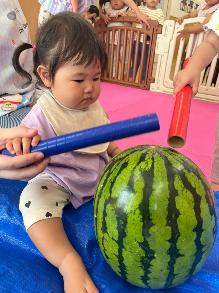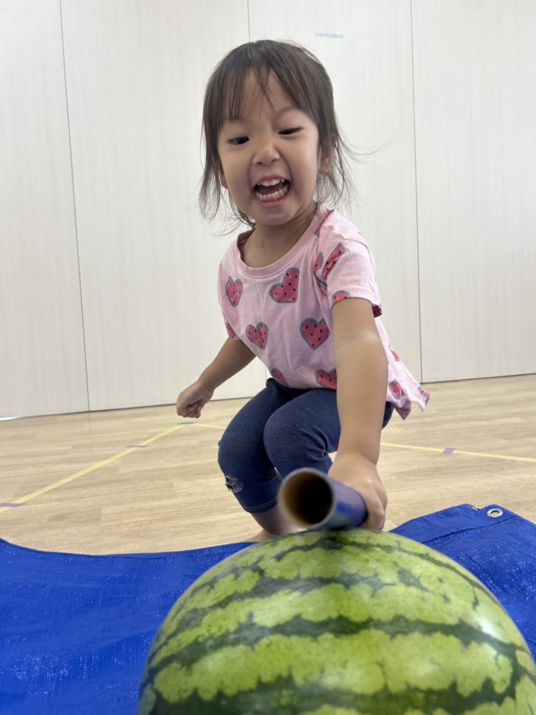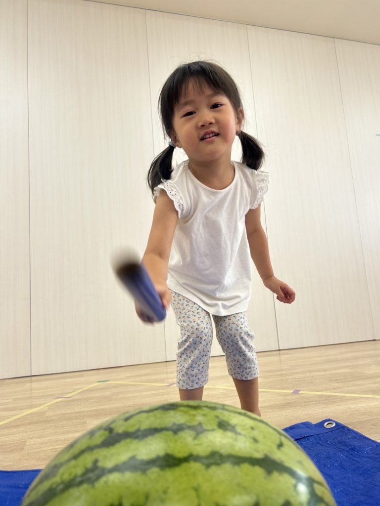 とても興味津々👀!がんばってすいかを叩く女の子たちです☺