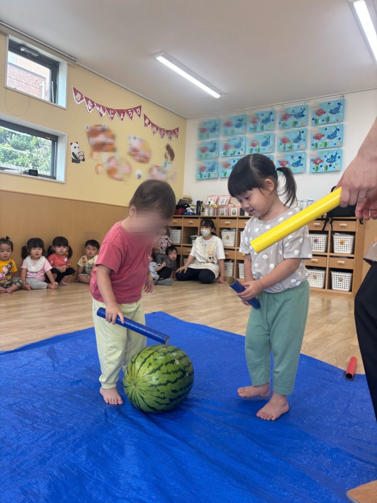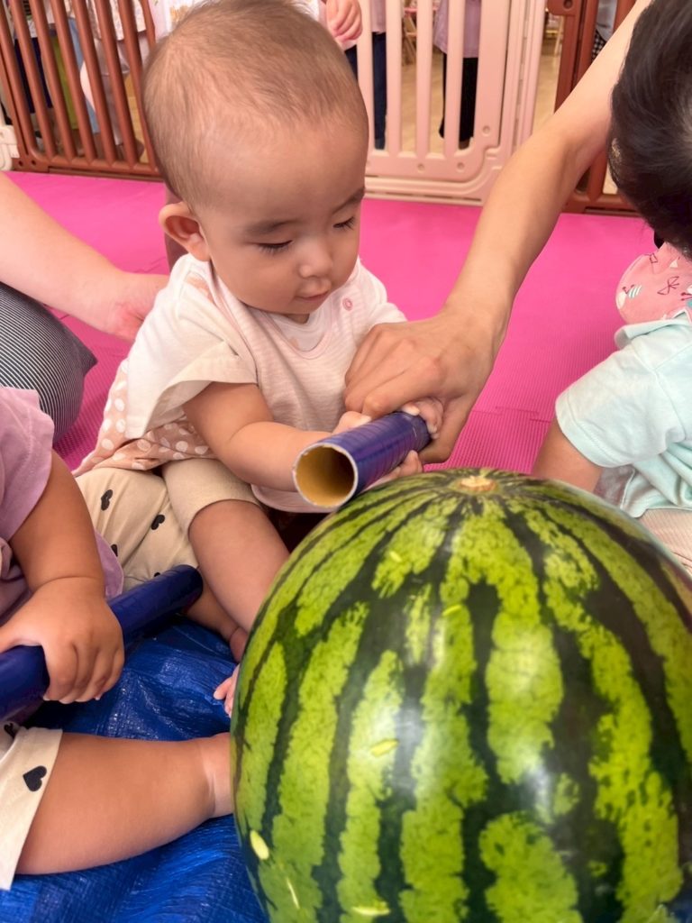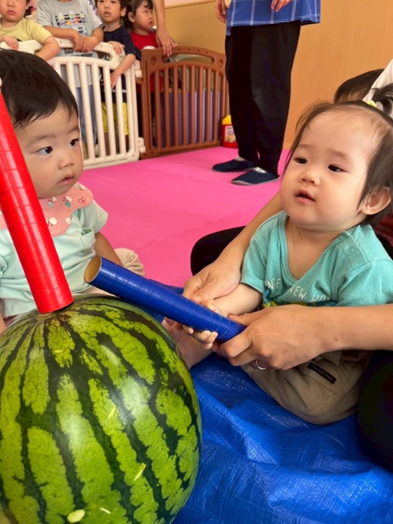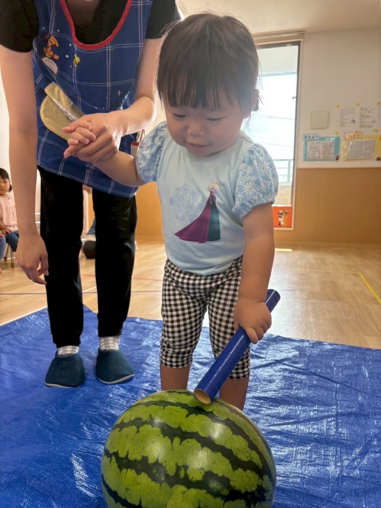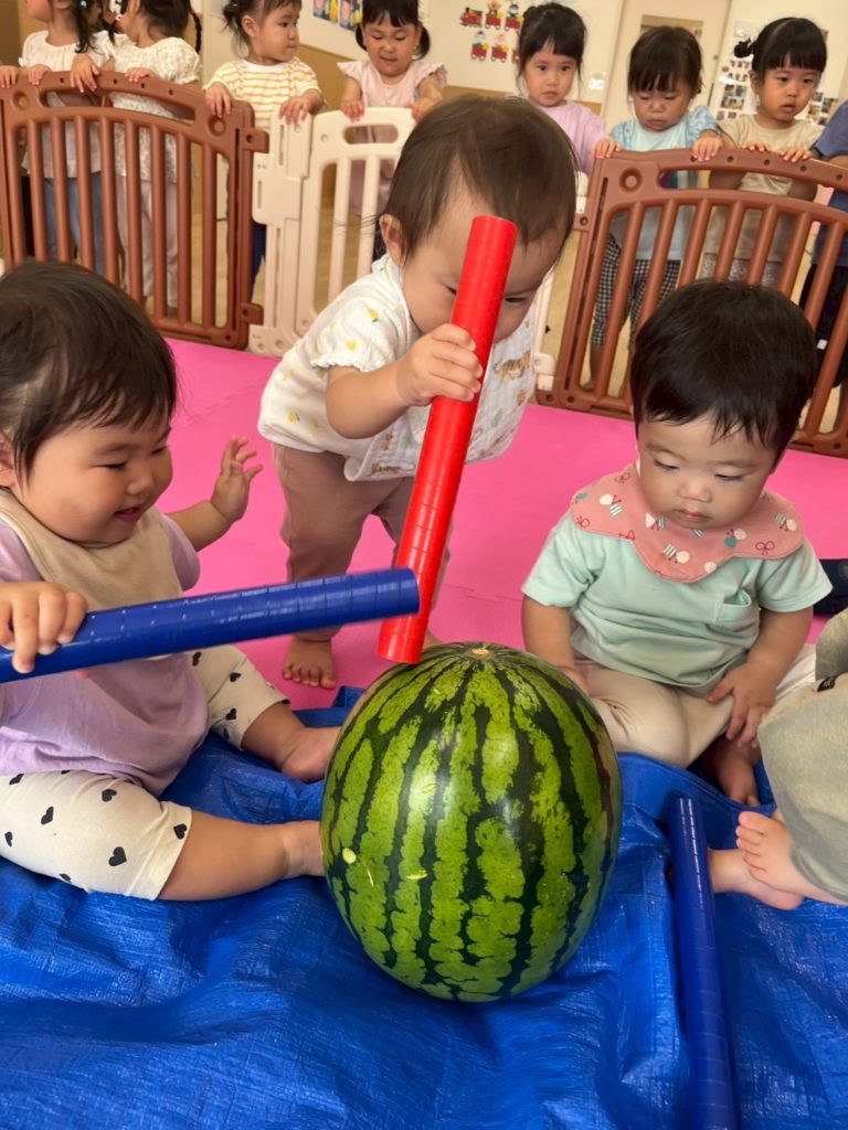 とても興味津々👀!がんばってすいかを叩く女の子たちです☺