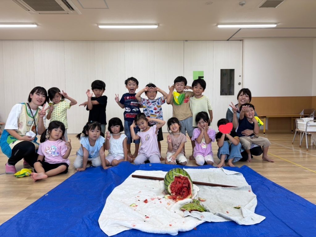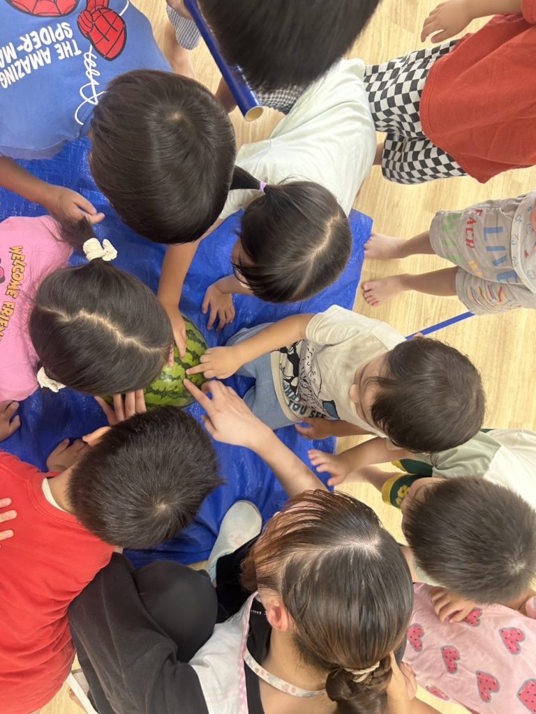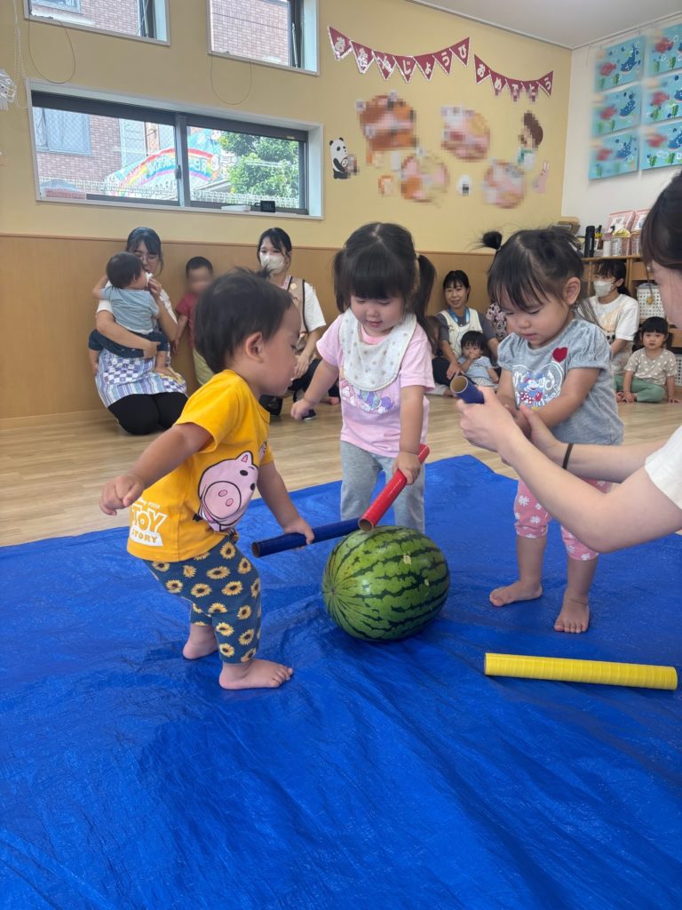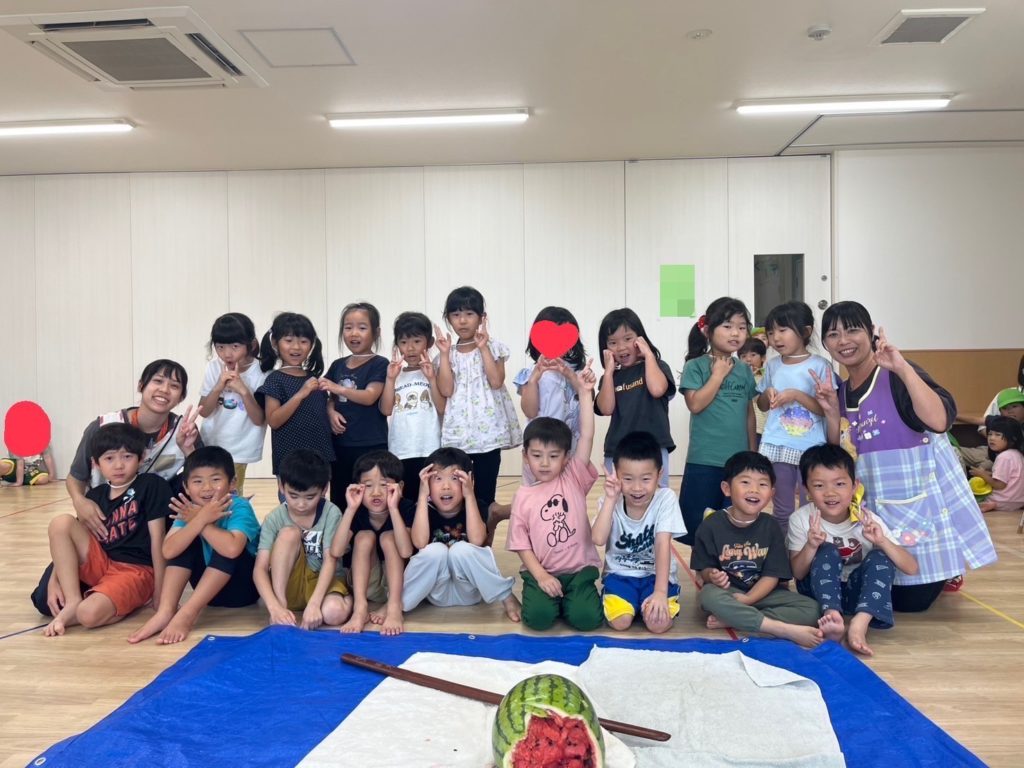 たいよう組のお友だちが応援しに来てくれたおかげで楽しくすいか割りができたよ☆