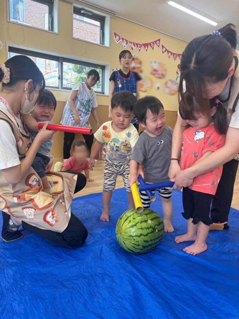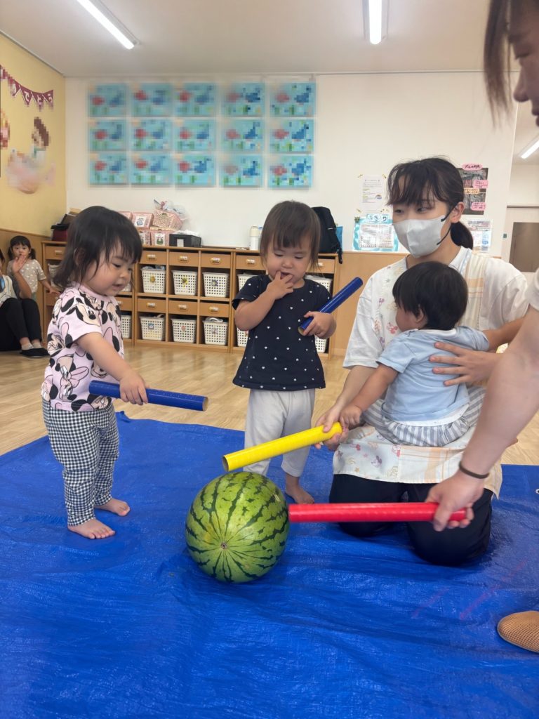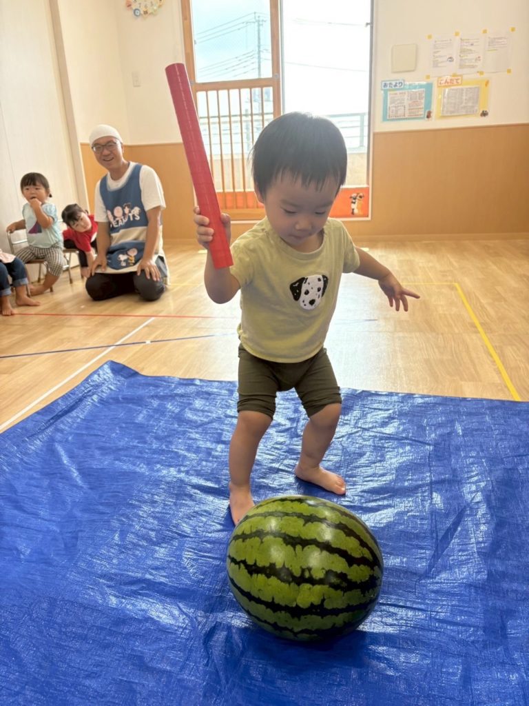 ゆめ組のお友だちは、その場でぐるぐる回ってからすいか割り!