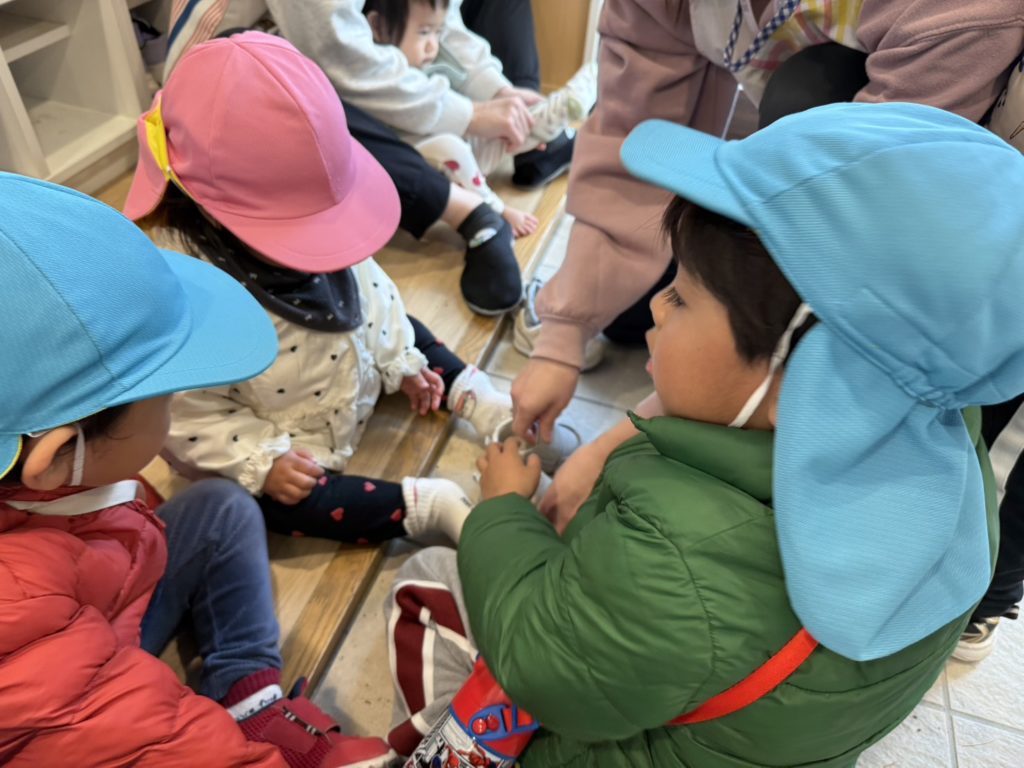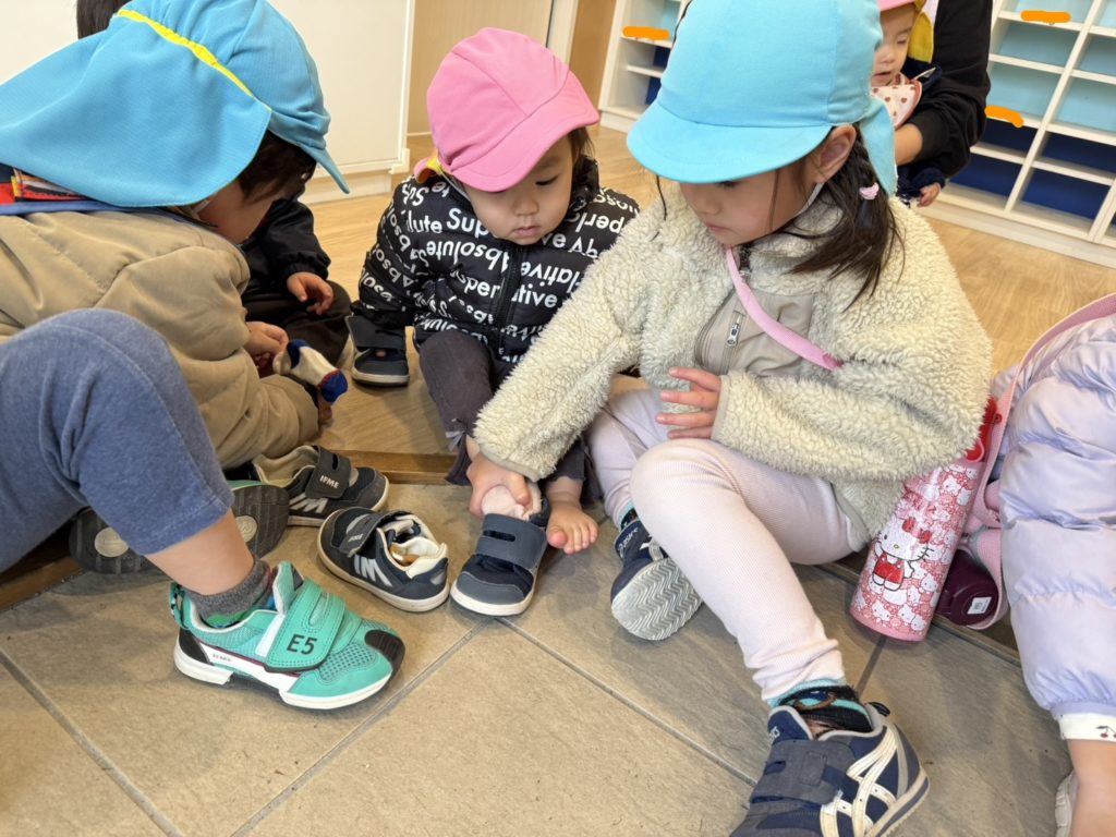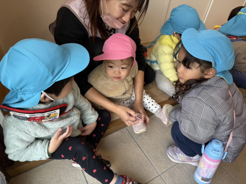 お外へ行く時間になると、うみ組のお友だちが靴を履かせるお手伝い💗