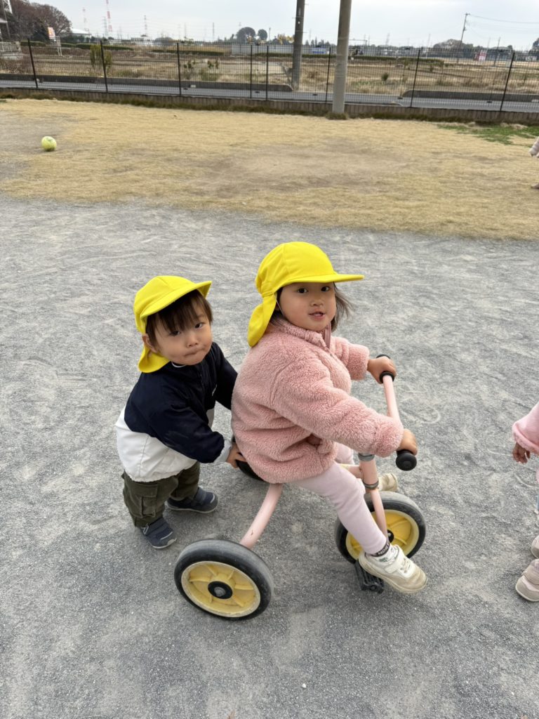 園庭では、ほし組のお友だちが遊んでおり、三輪車を仲良く押し合いっこです👏