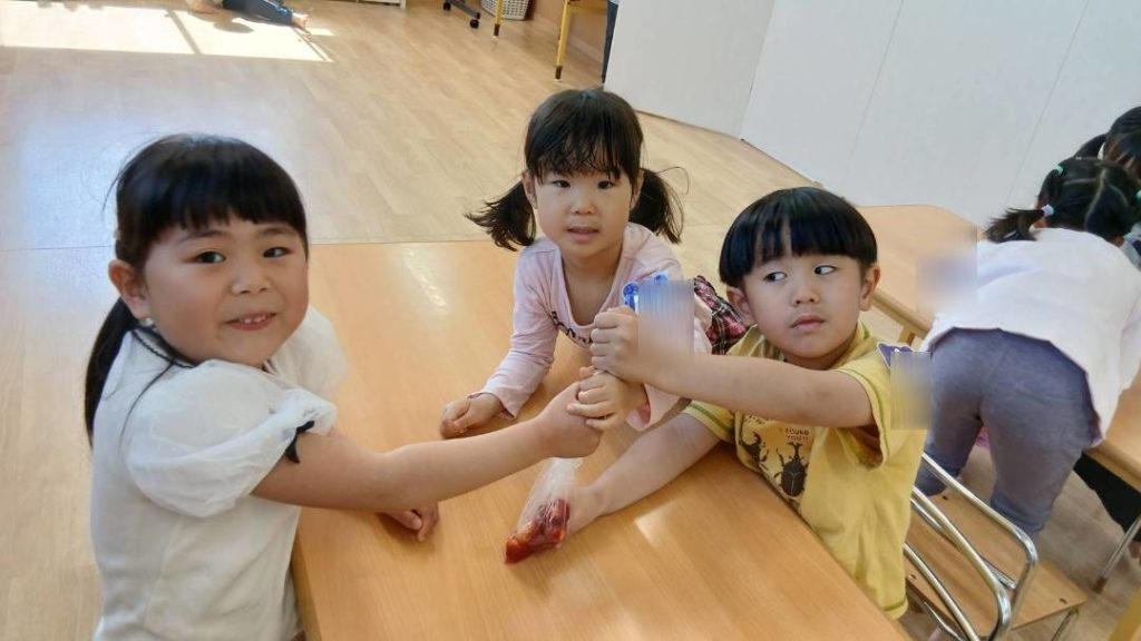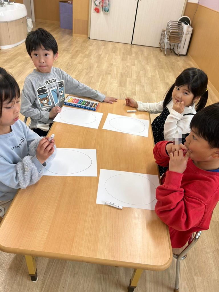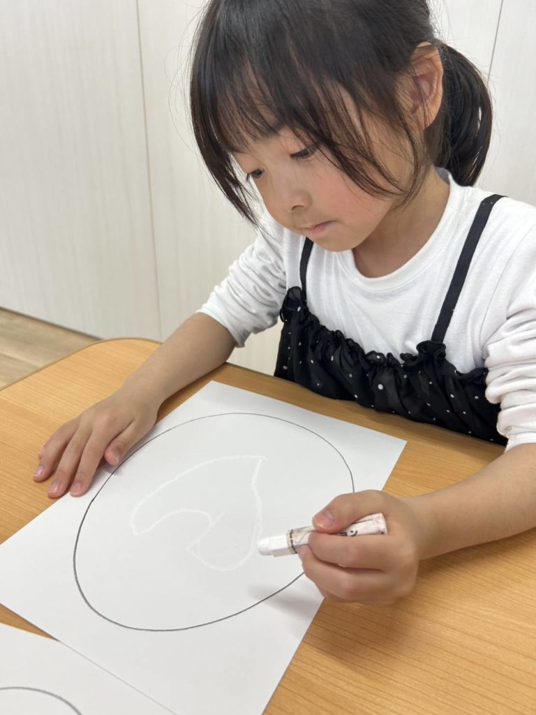たまごには白のクレヨンで絵を描いていましたが、意外に見えるよ!何を描いたでしょう〜!とグループで会話を楽しみながら取り組んでいました♪