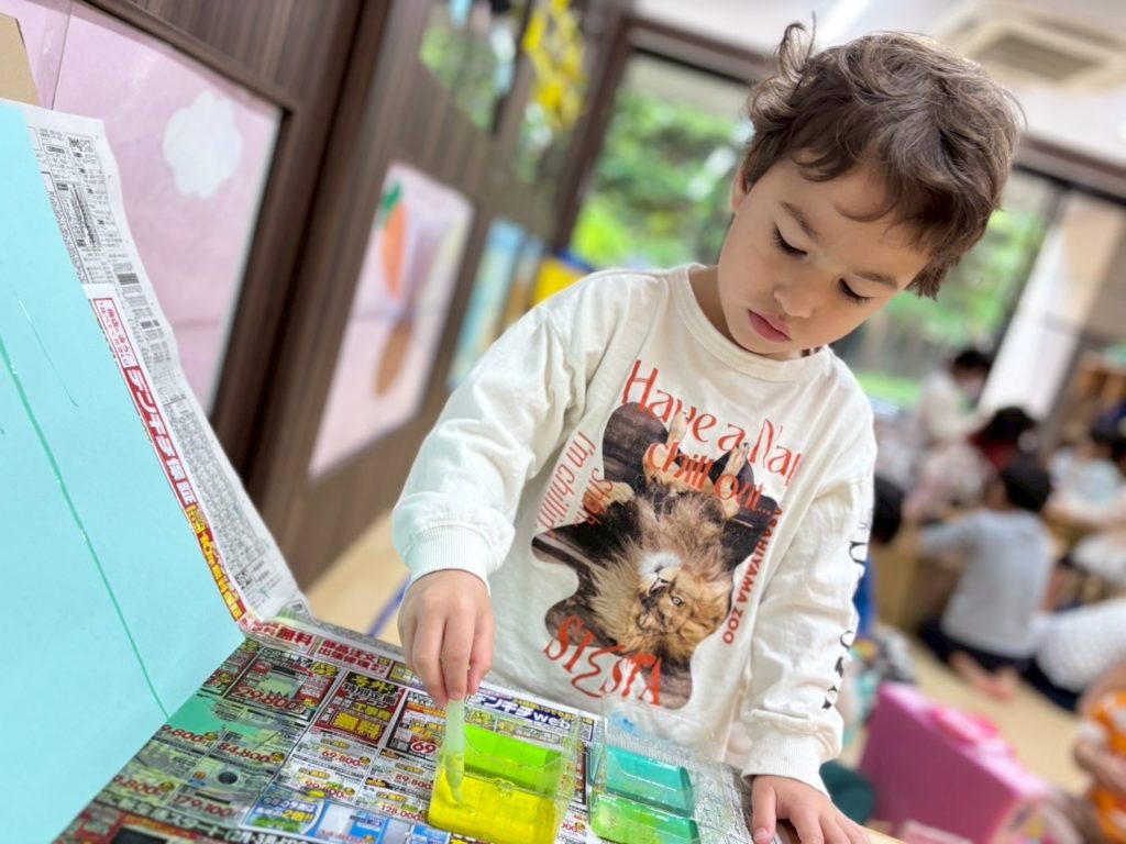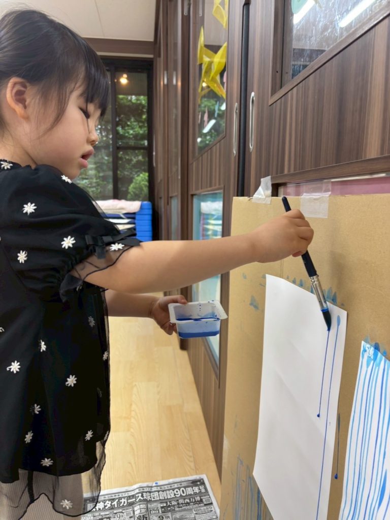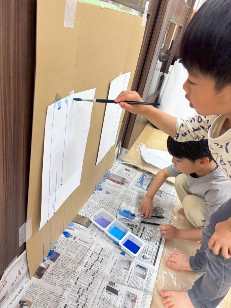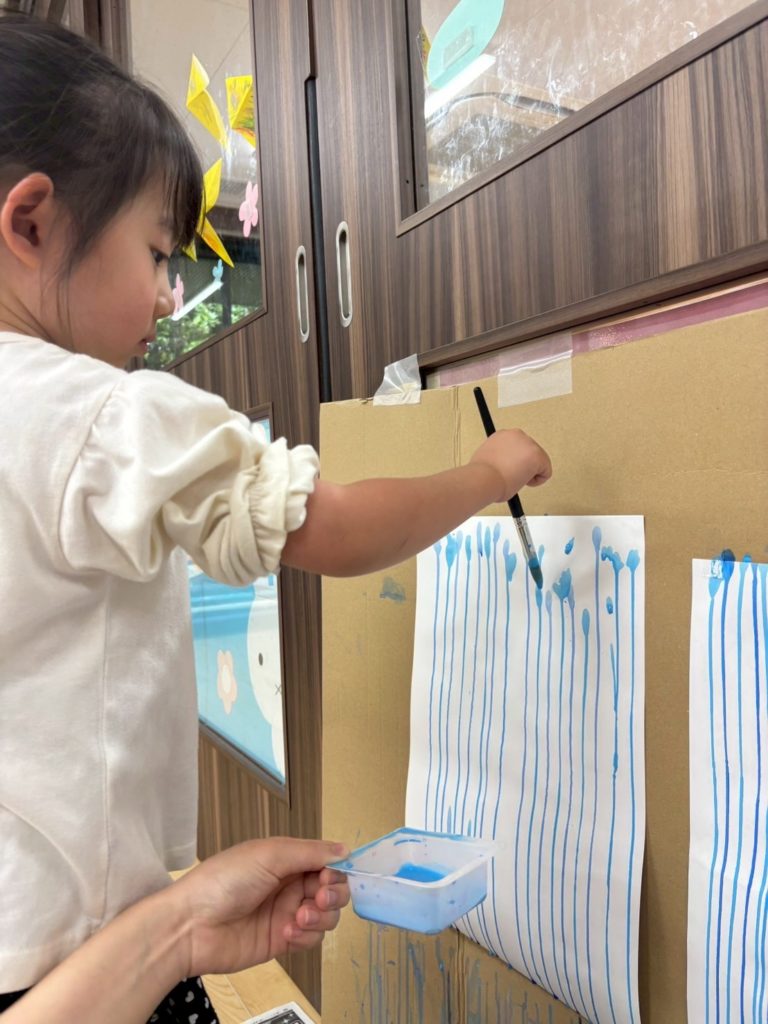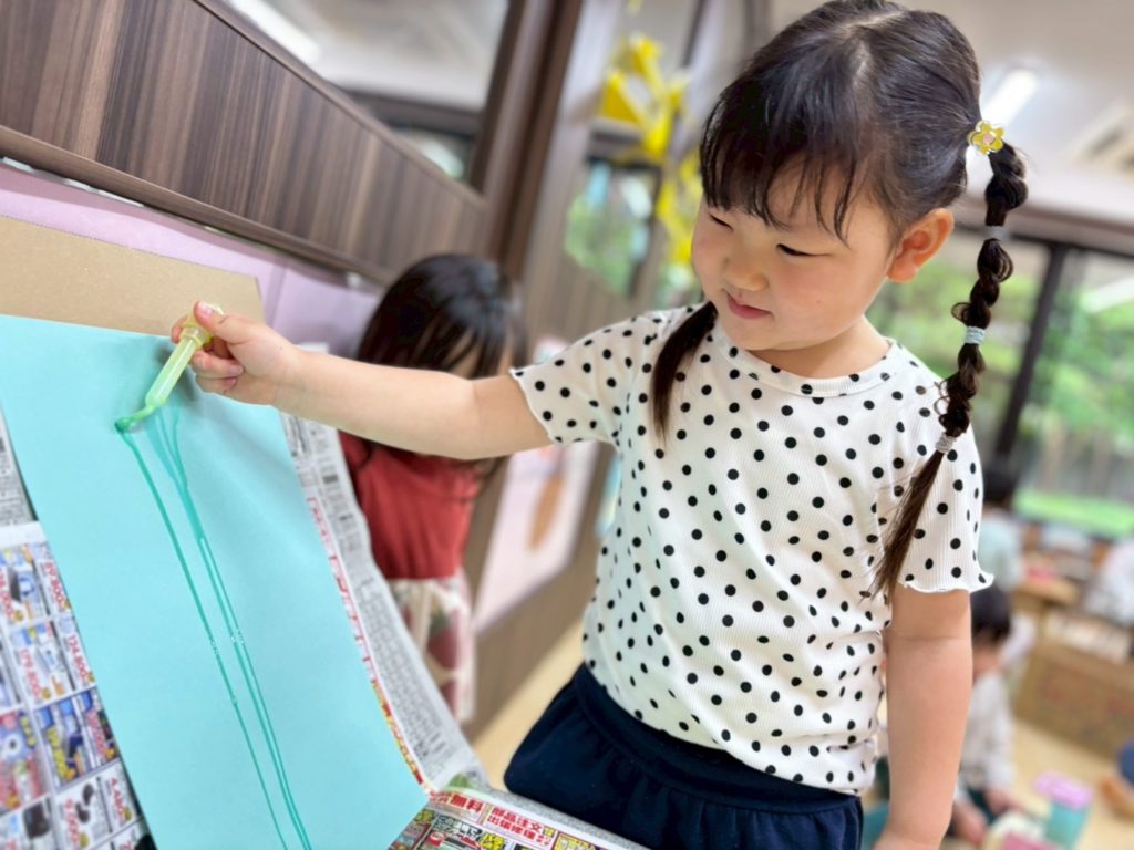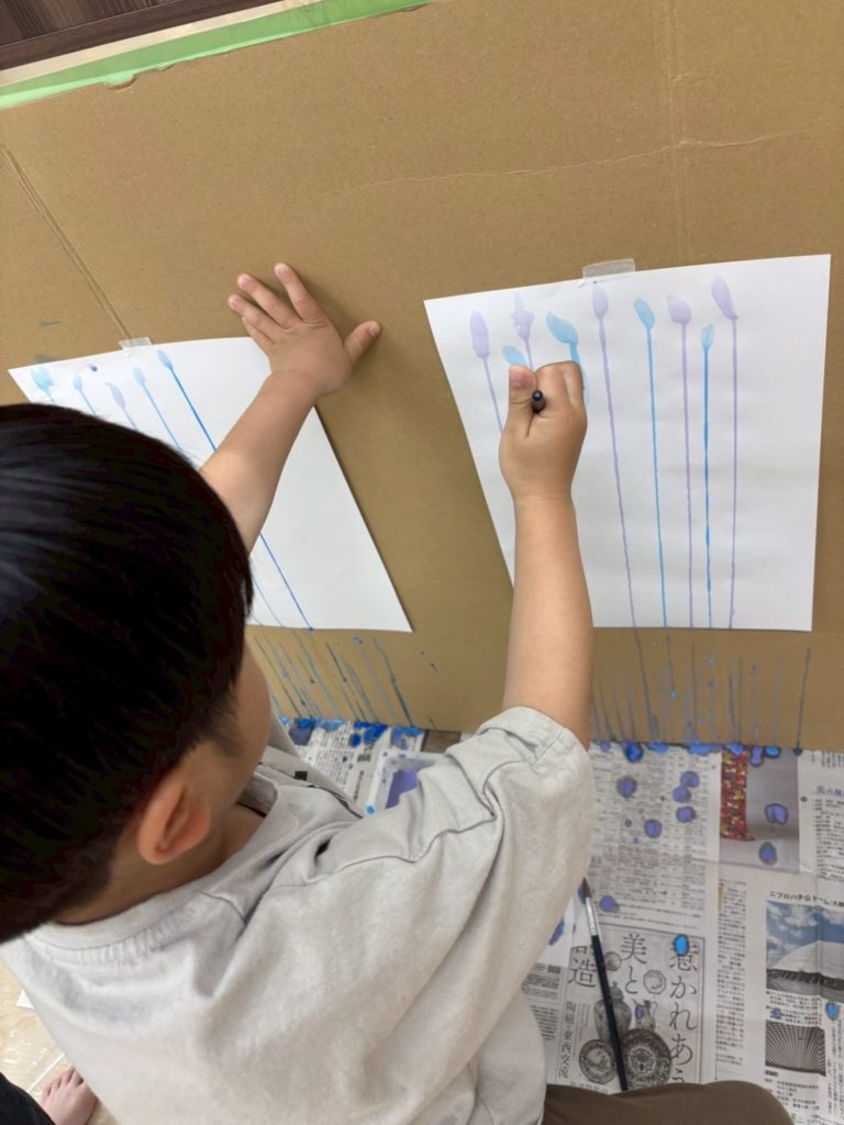 かもめ組では、絵の具をスポイトで吸い上げて、画用紙のてっぺんに ぽたり…