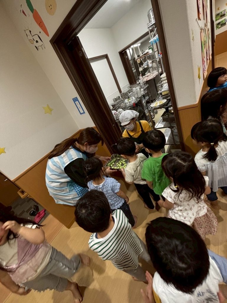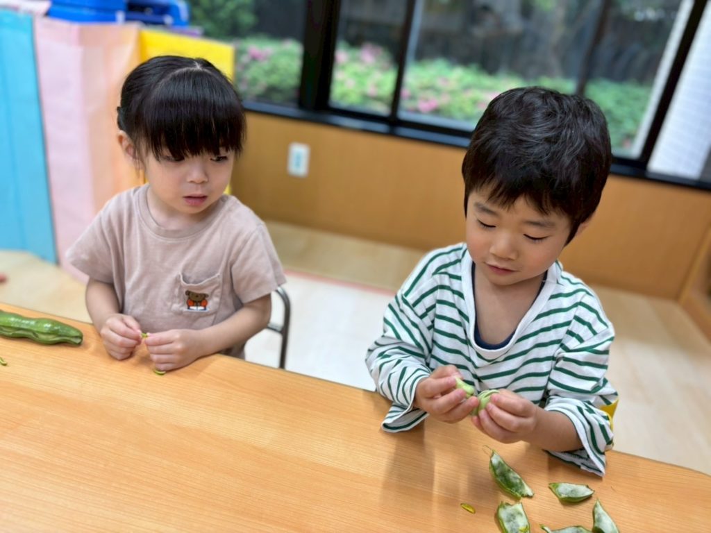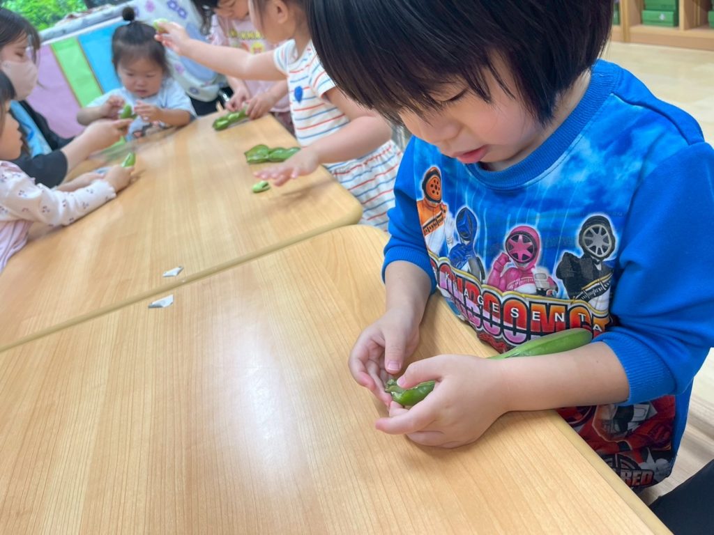 力を合わせて剥いた そら豆を、給食室へ持っていくよ。
