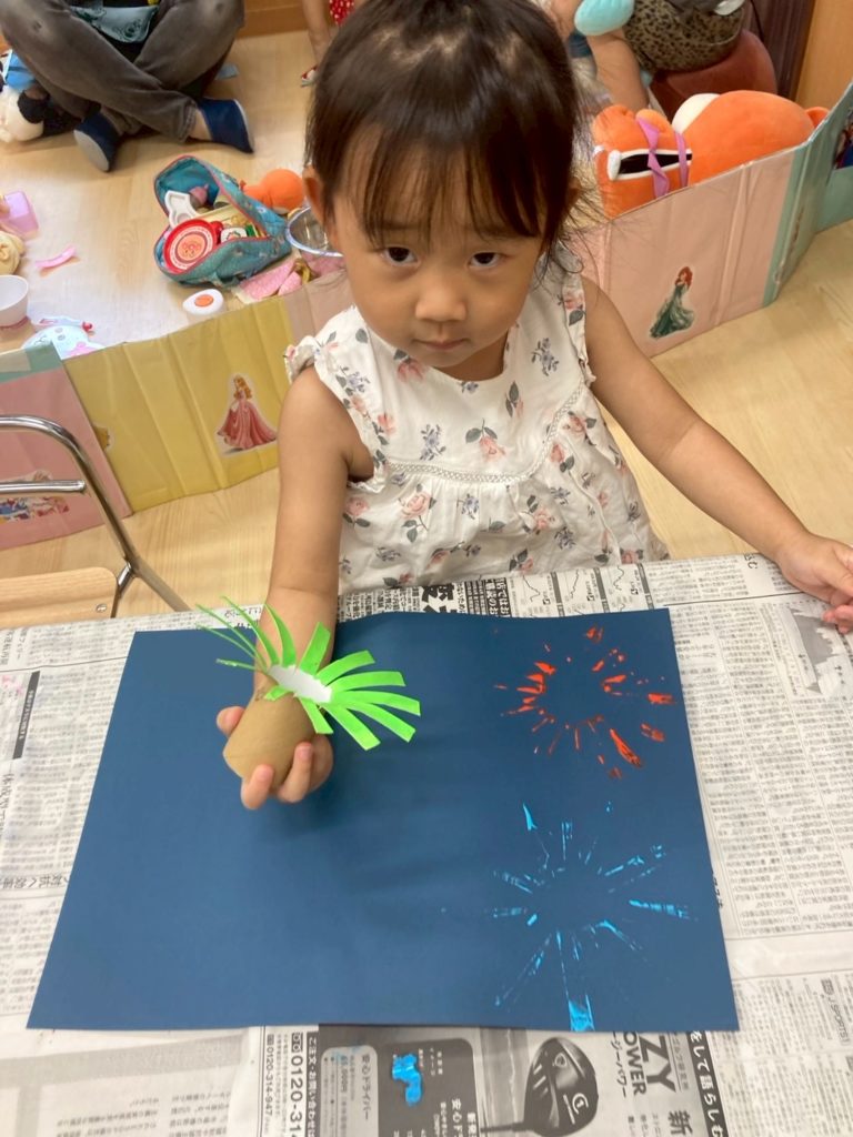 トイレットペーパーの芯を手にスタンプを楽しむあざらし組のお友だち。