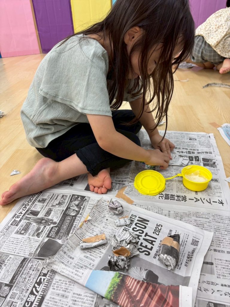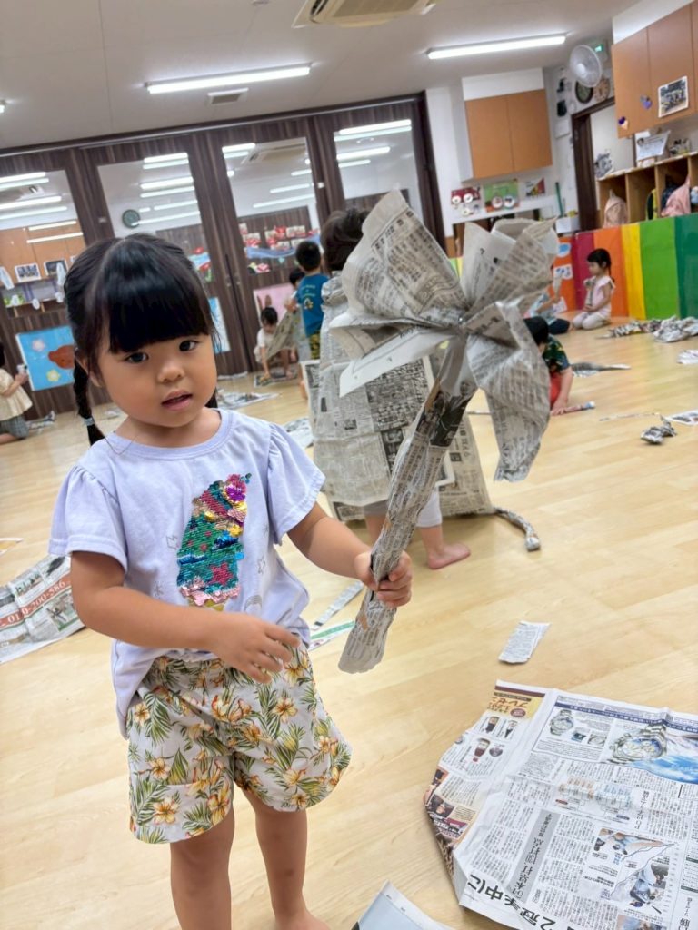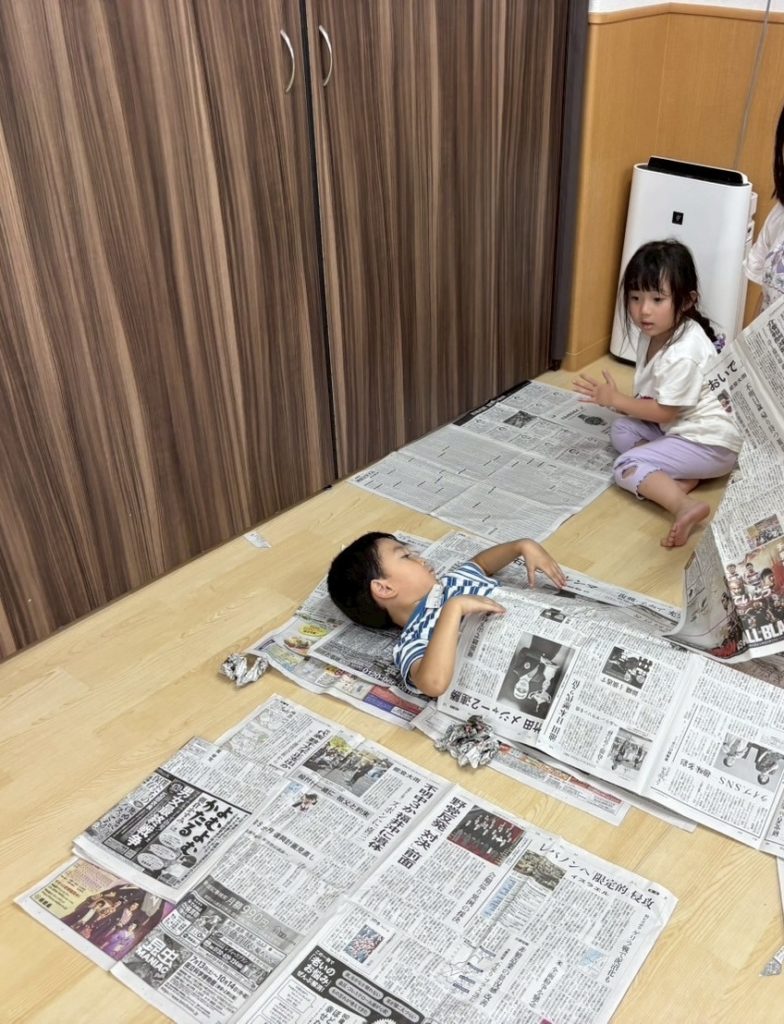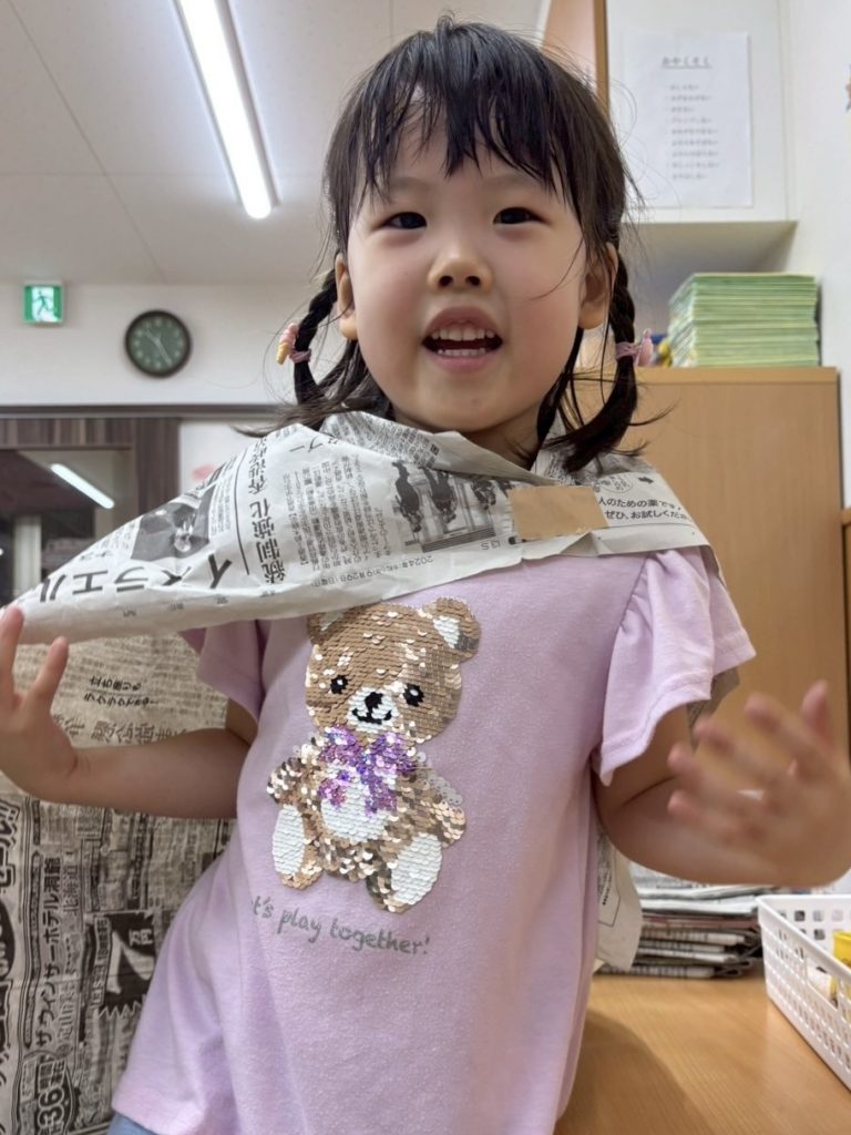 今日は、かもめ組・いるか組・くじら組のお友だちみんなで、新聞遊びをしたよ。