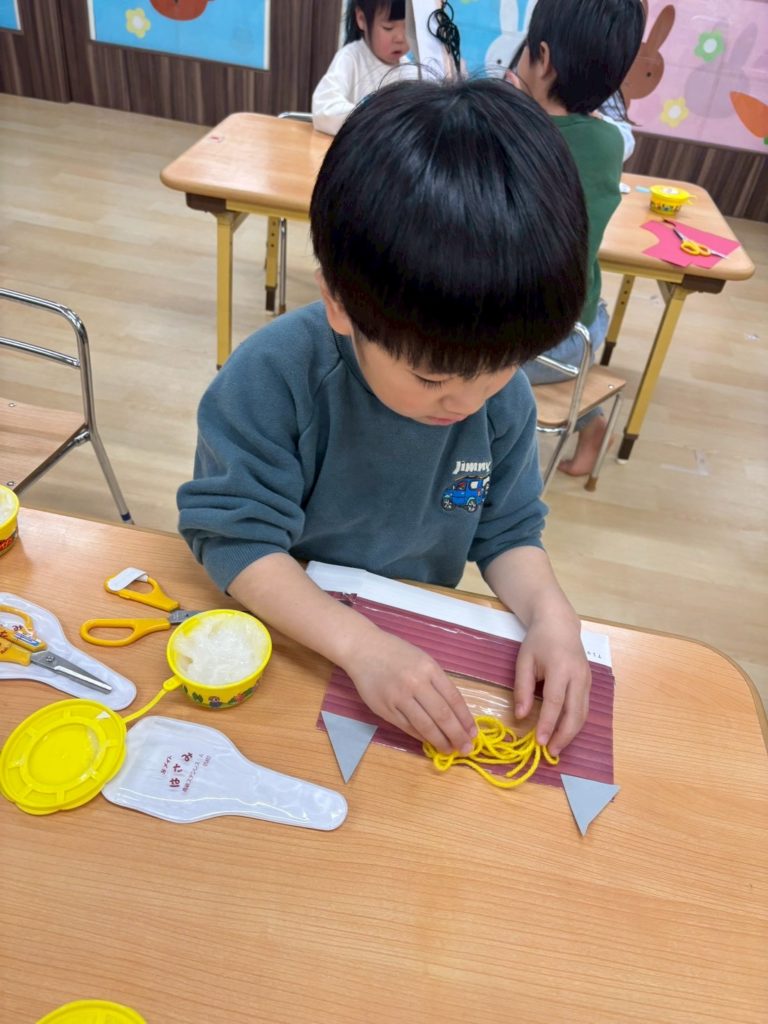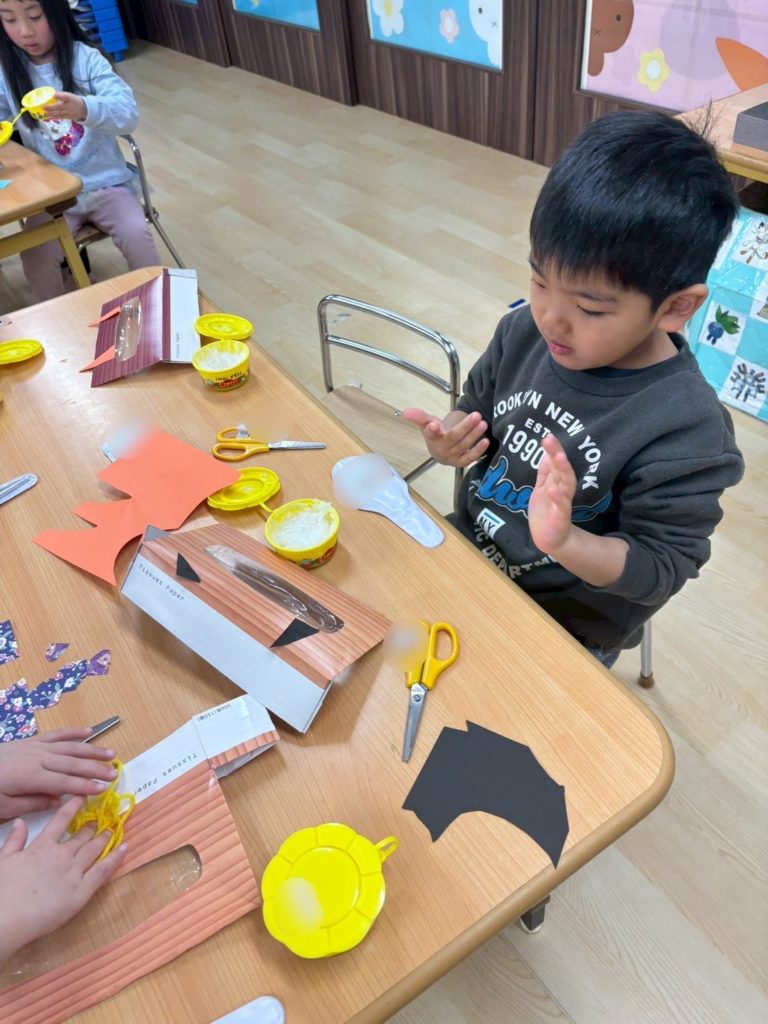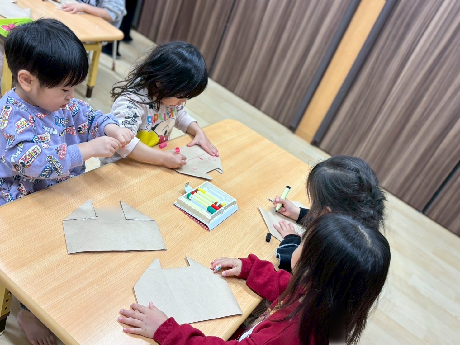 2月に向けて、一緒に製作を楽しむあざらし組とかもめ組のお友だち。 何の形かわかるかな? 2つの「とんがり」がヒントだよ。 マーカーでお絵描きしてみよう。