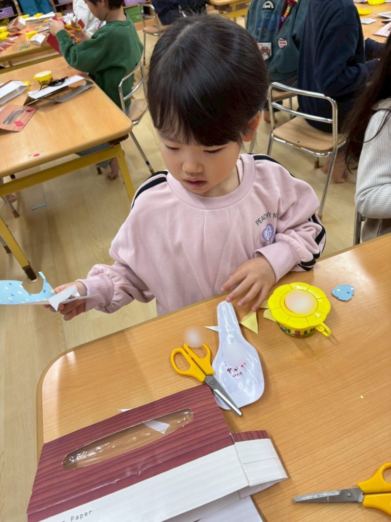 お友だちは、鬼退治のためにお面を作っていますよ。