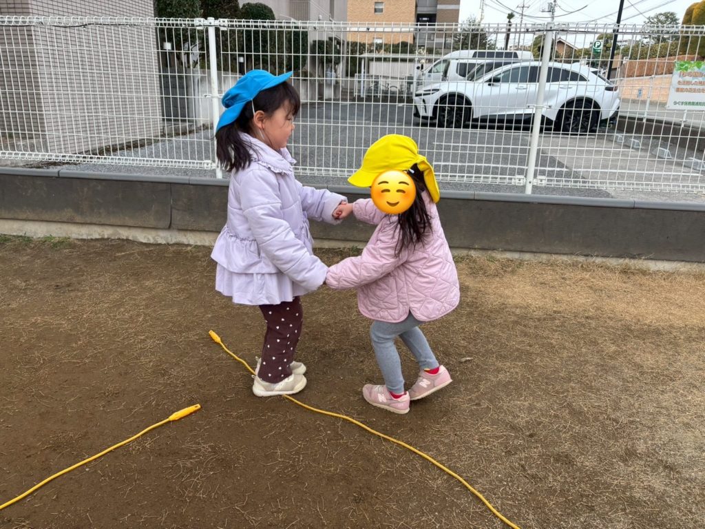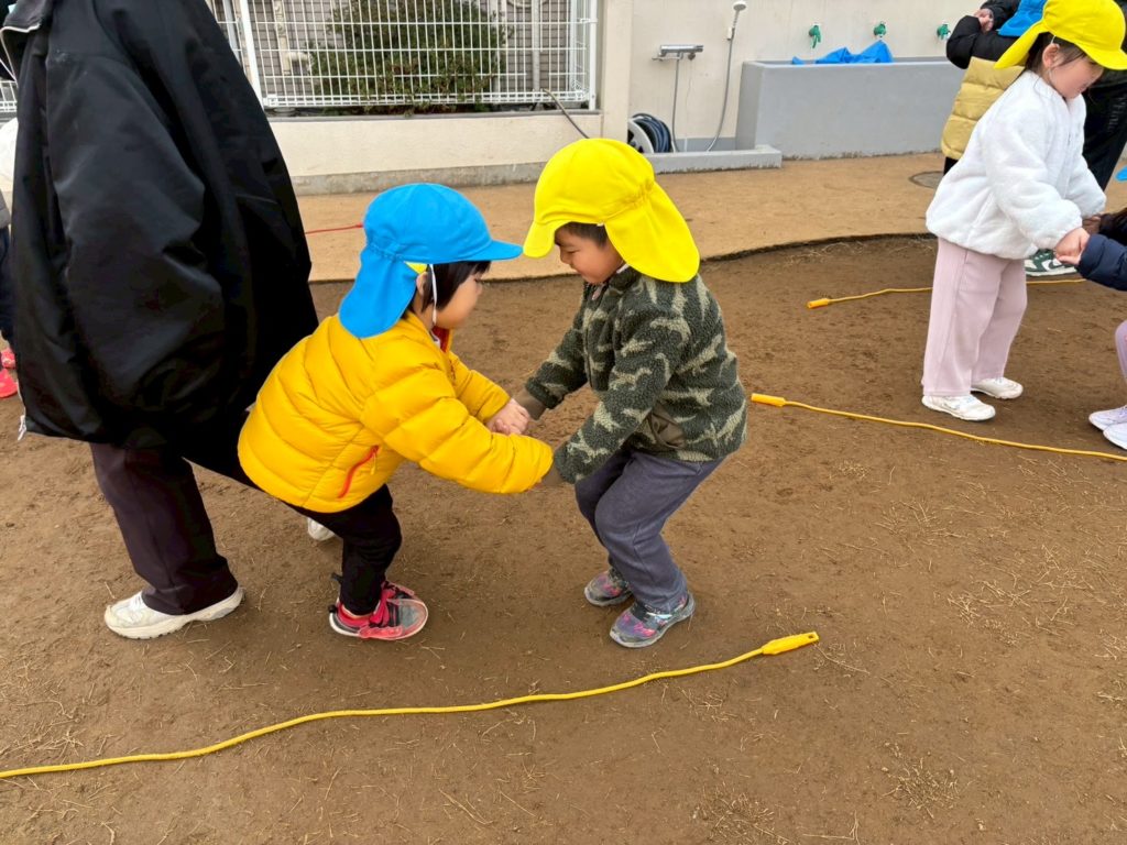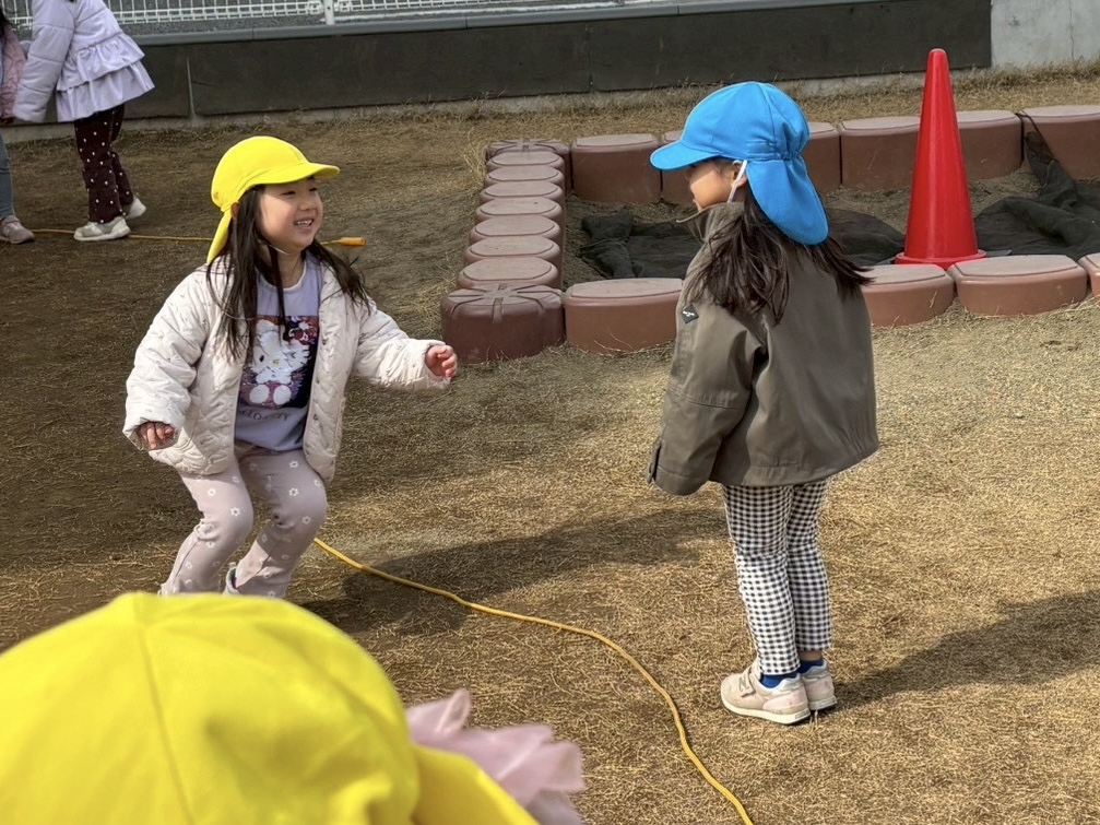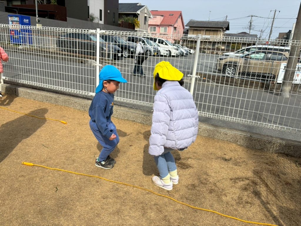 手を繋いで一緒に縄を跳び越えてみたり、交互に跳んでみたりしたよ。
