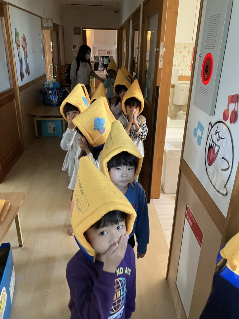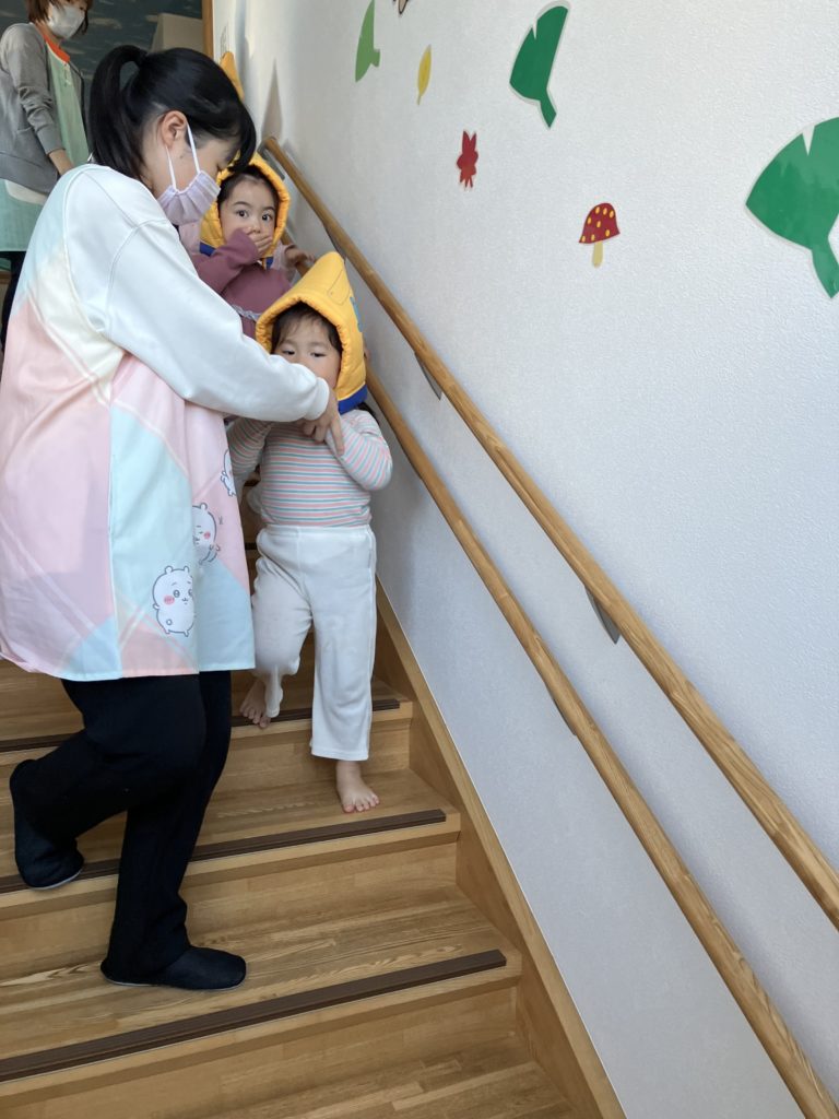 今日はお昼寝明けに避難訓練がありました。