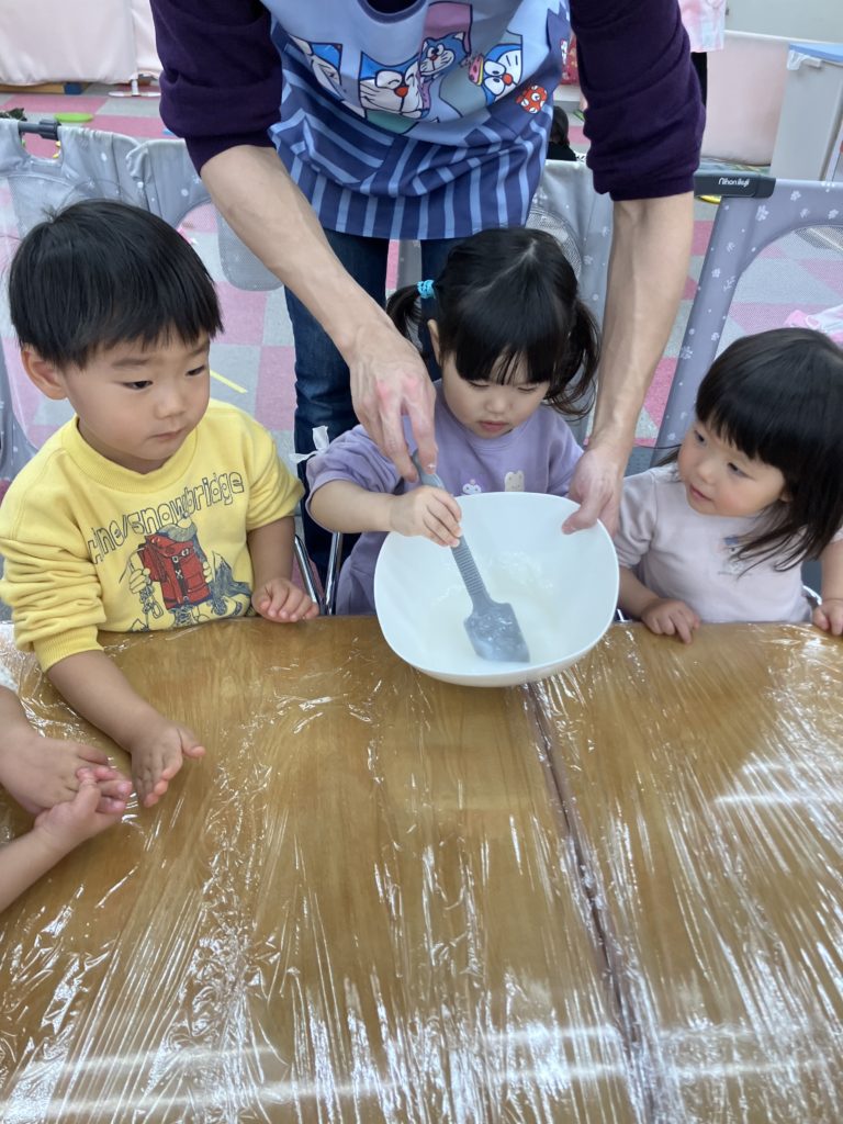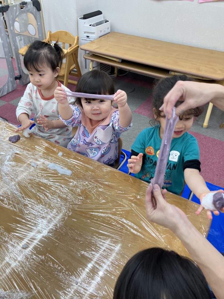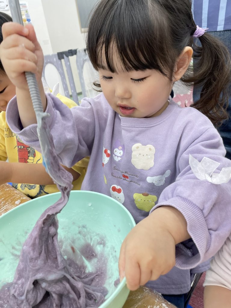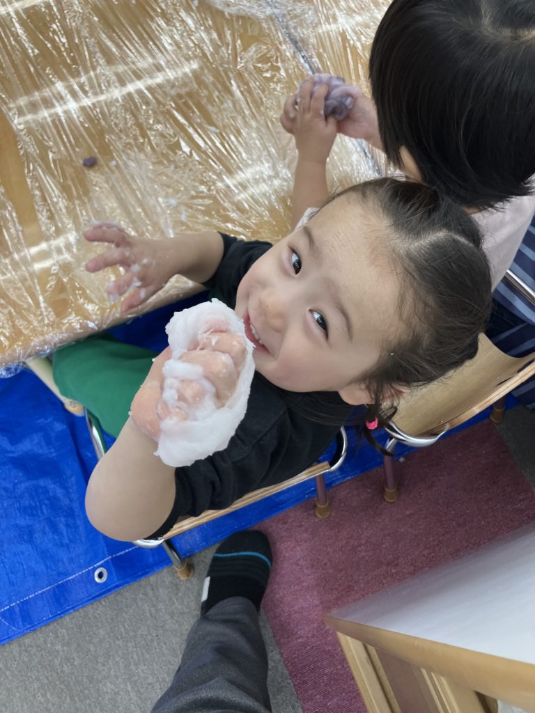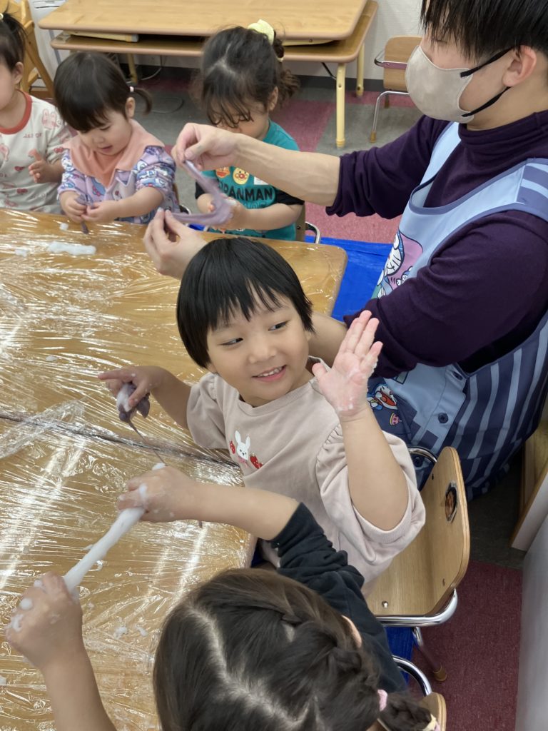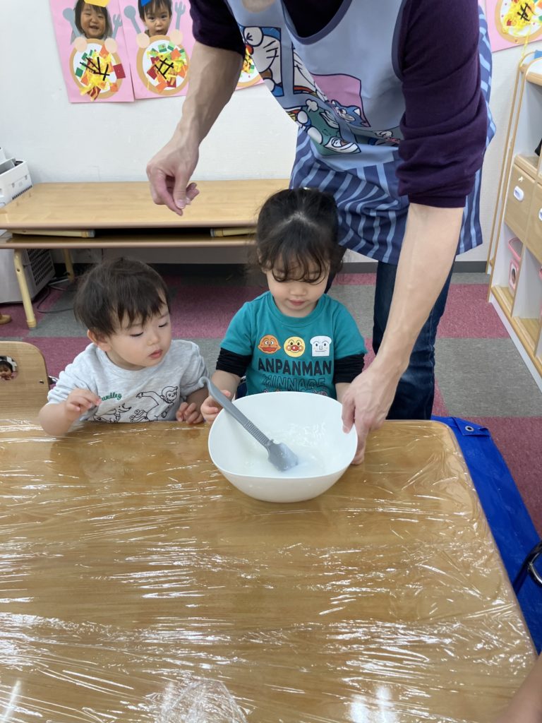 今日は、でんぷんのりを使ってスライム作りをしました。スライムの感触を楽しみましたよ✨