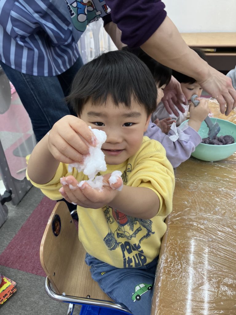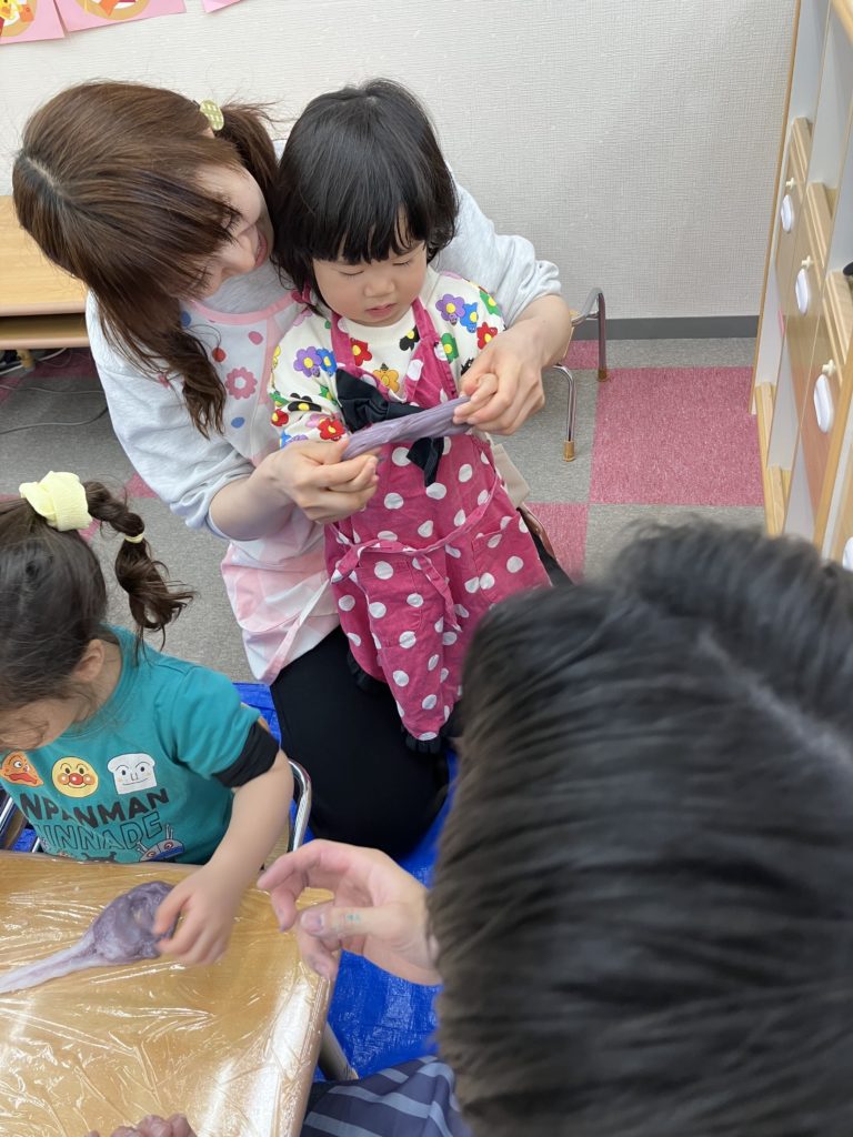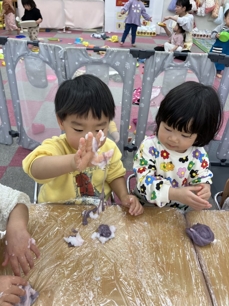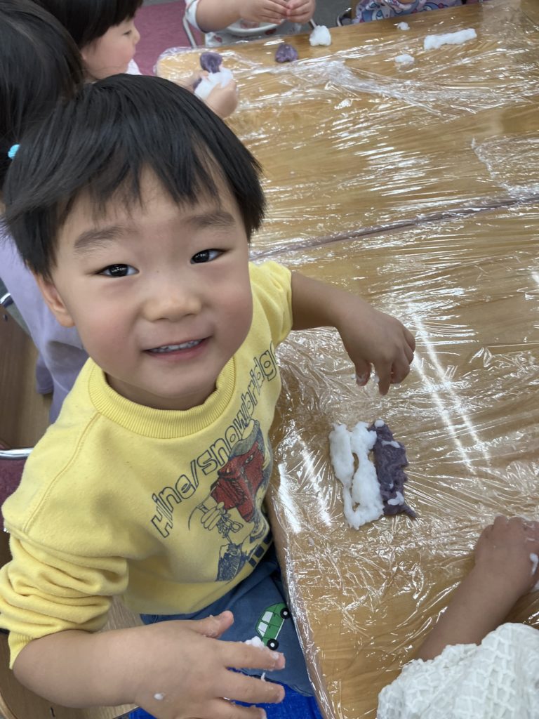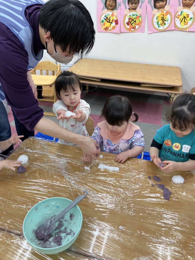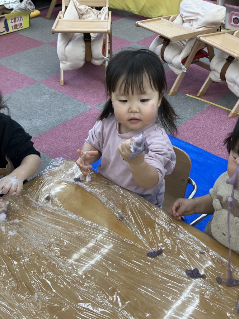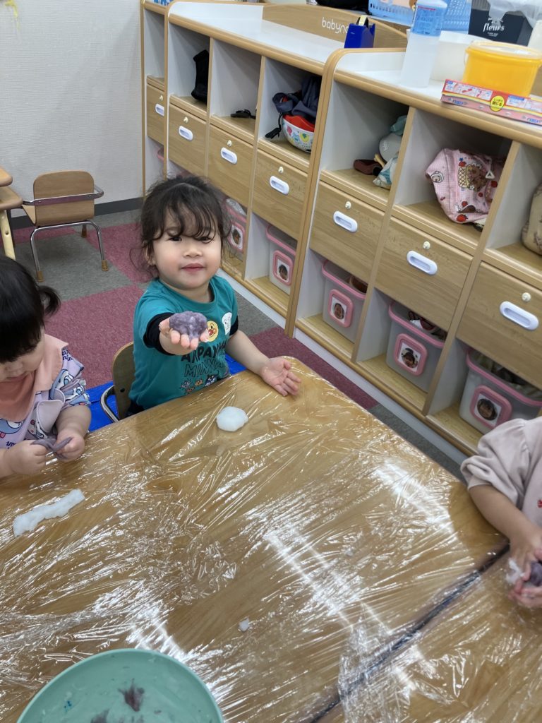 今日は、でんぷんのりを使ってスライム作りをしました。スライムの感触を楽しみましたよ✨